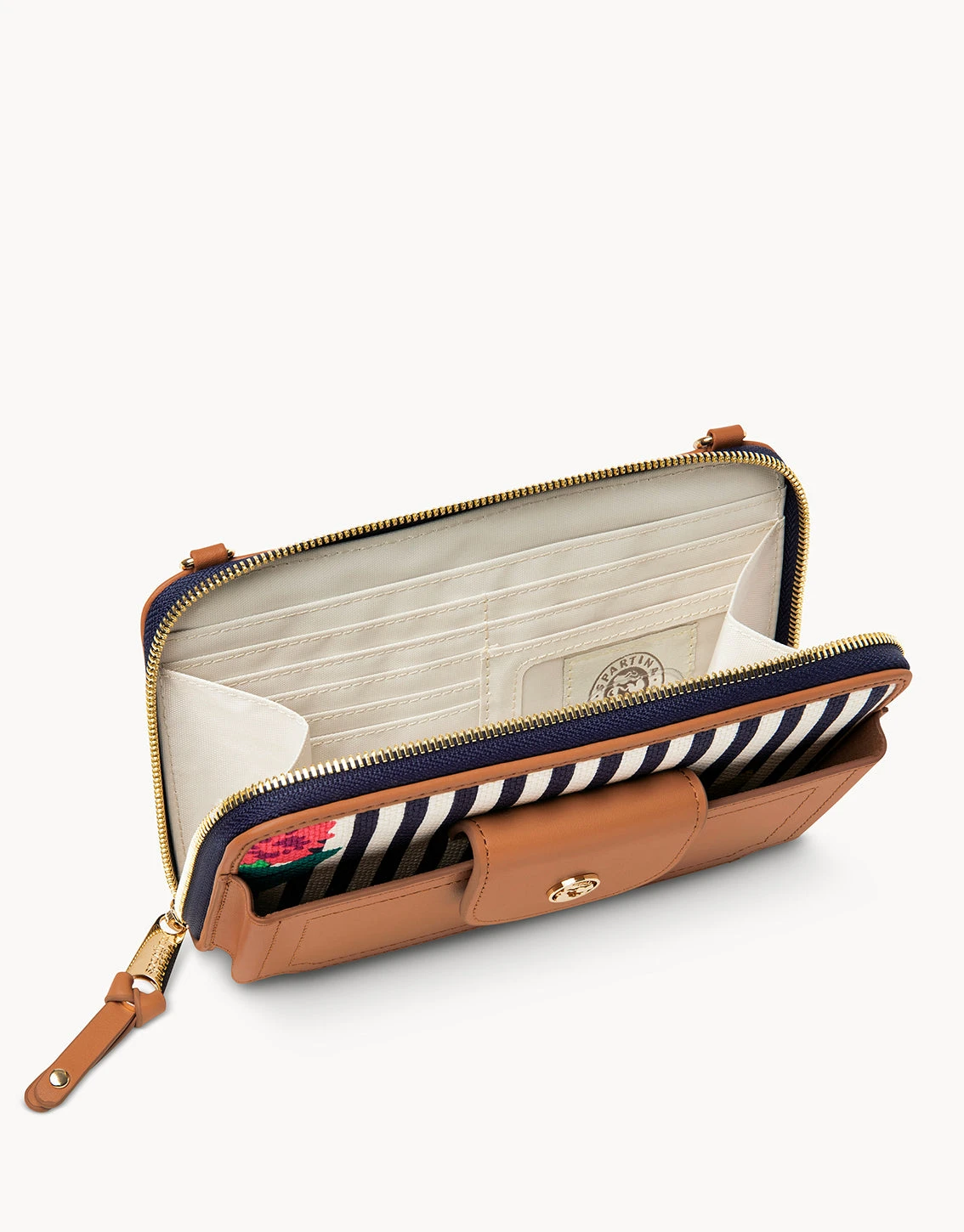 Is it a slim and sleek crossbody? Or can it be a trendy, oversized wallet? Yes to both! Our Multi Phone Crossbody is very versatile thanks to the clasps of a crossbody strap. With a secure, all around zipper underneath the magnetic leather phone closure, this crossbody fits an array of phone size. Inside, 18 card slots and 2 long slip pockets hold your cards and receipts, while coins will find a home in the back zipper pocket.