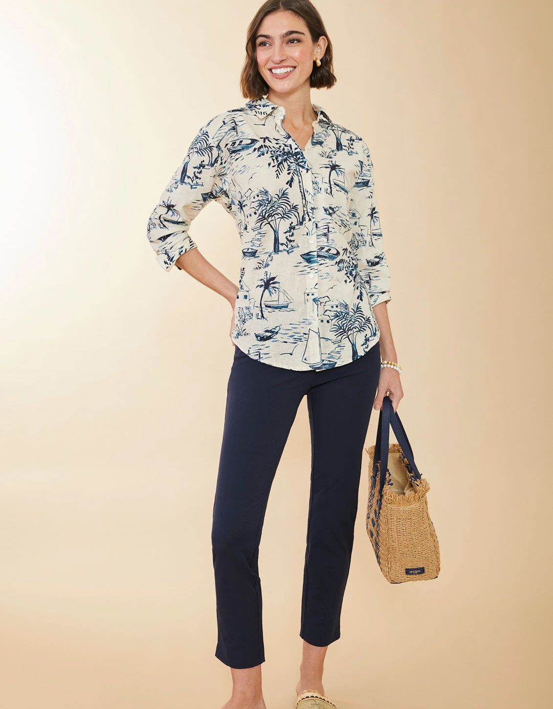 Button up this soft, comfortable linen and cotton blend shirt. With long sleeves to roll up or down, a classic collar, and faux shell summarys, our Aida Buttonfront Shirt was made to layer or wear on its own this season. Wear over our Maren Pull-On Pant and under our Lorna Varsity Sweater.
