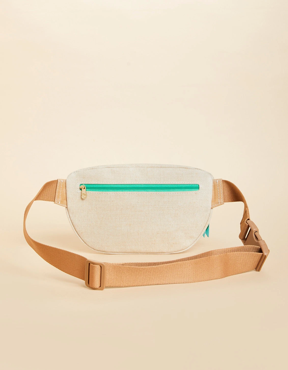 Hands up for hands-free! Our Armada Belt Bag is perfect for keeping your goods secure around your waist or across your chest. A front zip pocket holds your phone, keys, lipstick, and 2 cards (with RFID lining), with a slim zip pocket on the back. Made with an easy-to-wipe-clean, splash-proof, stain-resistant, laminated cotton and jute.