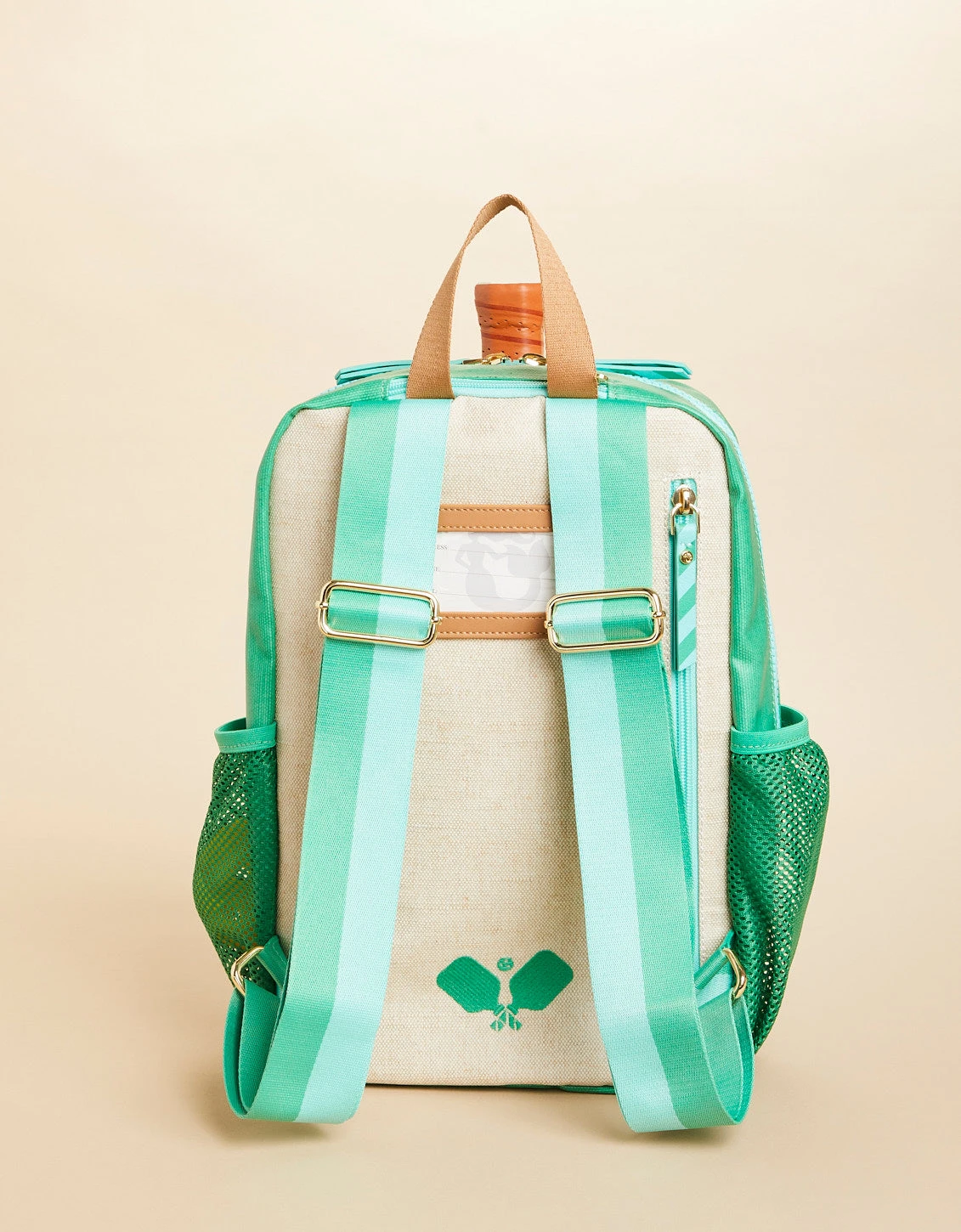Your next match has never been so stylish with our super-durable, laminated cotton and jute Pickleball Backpack! Designed to hold 1 to 2 of your favorite pickleball paddles in a front zipper pocket. On the inside, a large elastic pocket and large mesh zipper pocket holds everything else, plus your keys— car or locker—on a handy, interior keyring.