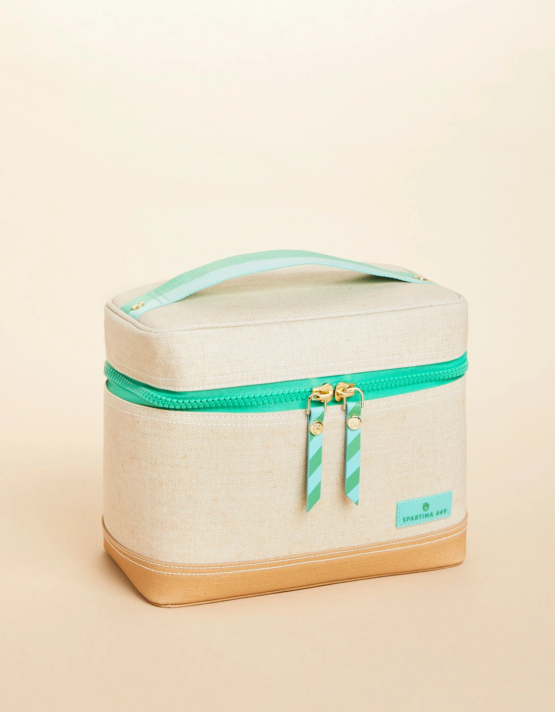 Complete your Spartina travel set with our durable, laminated cotton and jute Train Case, made for all of your morning routine necessities. Its striped zipper pulls open to a polyester lined interior includes a slip pocket along interior lid.