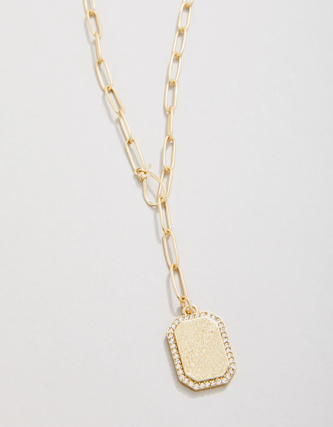Our Bascom Drop Necklace’s textured golden pendant is framed in tiny glass crystals on a lustrous 18kt matte gold plated paperclip chain. Featuring an adjustable hook closer that can be worn at different lengths for different drop styles. Simply beautiful with any outfit. A classic you will be pulling out of your jewelry case again and again.