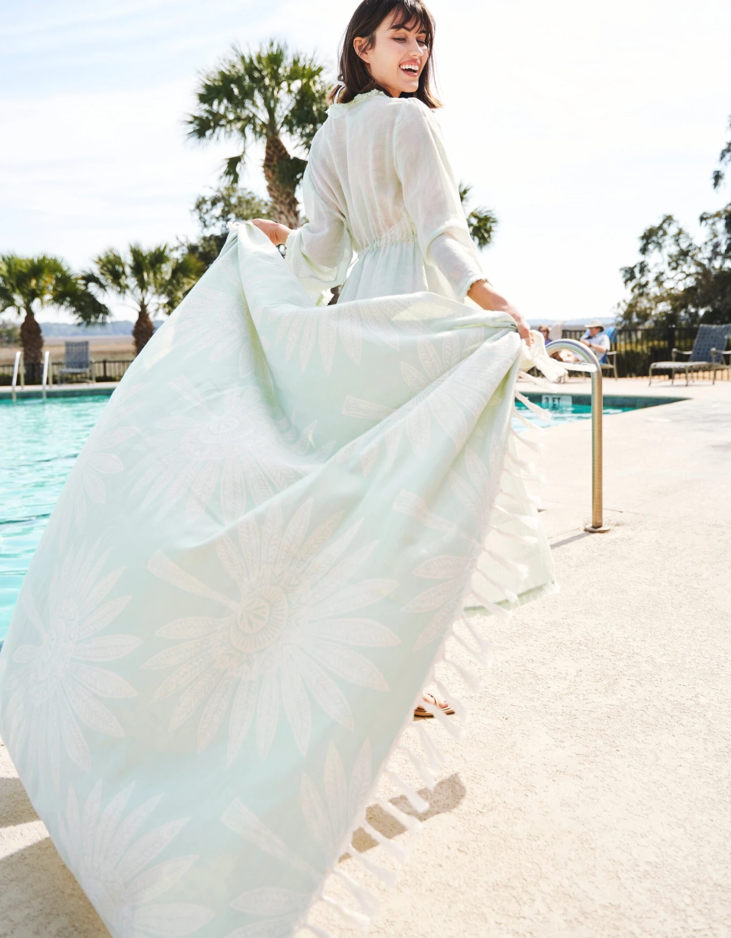 Wrap up in this beautiful woven jacquard blanket edged in fluffy tassels. Perfect for beach picnics, boat rides and porch swings. Made of 100% Turkish cotton, this blankets is durable and will only get softer over time. It dries quick and sand shakes right off. Beach days have never felt so good. Pair with our matching Beach Cover Up!