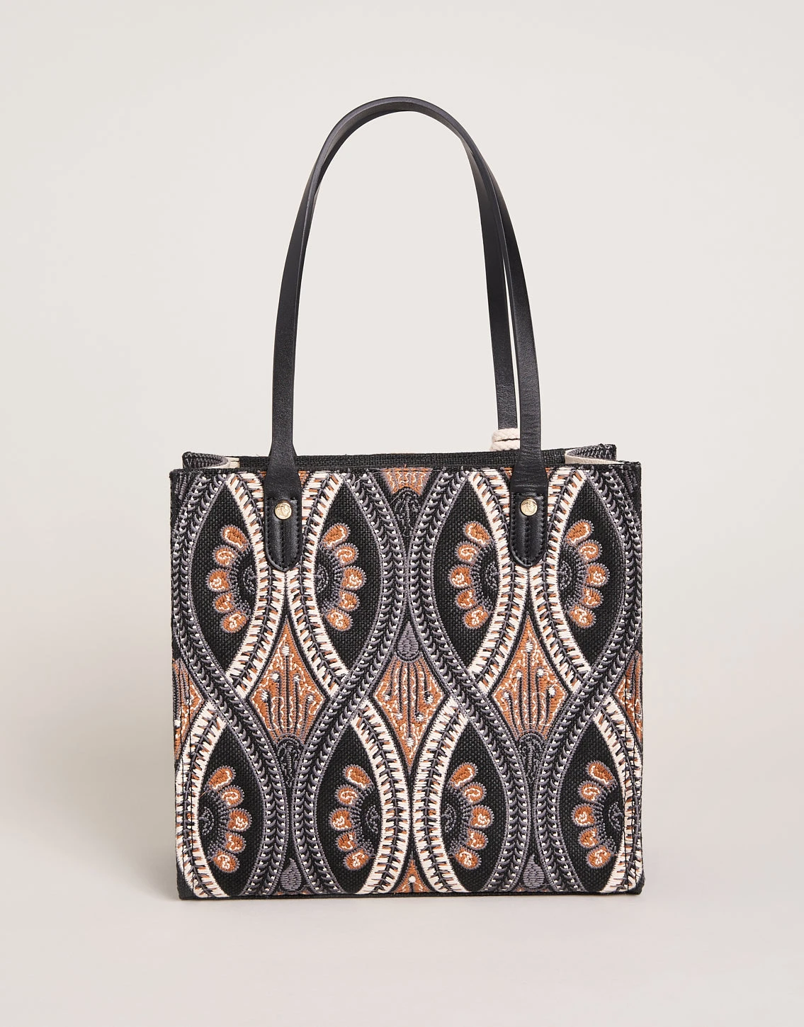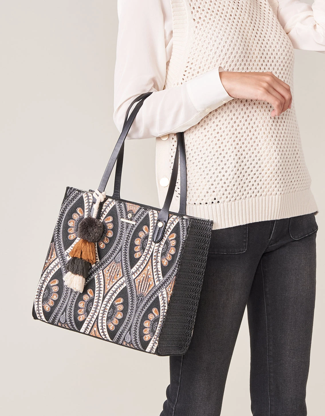 Gorgeous craftsmanship is all squared away in our Box Tote. Our plush batik embroidery surround this boxy beauty on all sides and while the tiered tassel fob keeps the look light. Leather shoulder straps and zip-top panel open to a linen interior, a zip and two slip pockets.