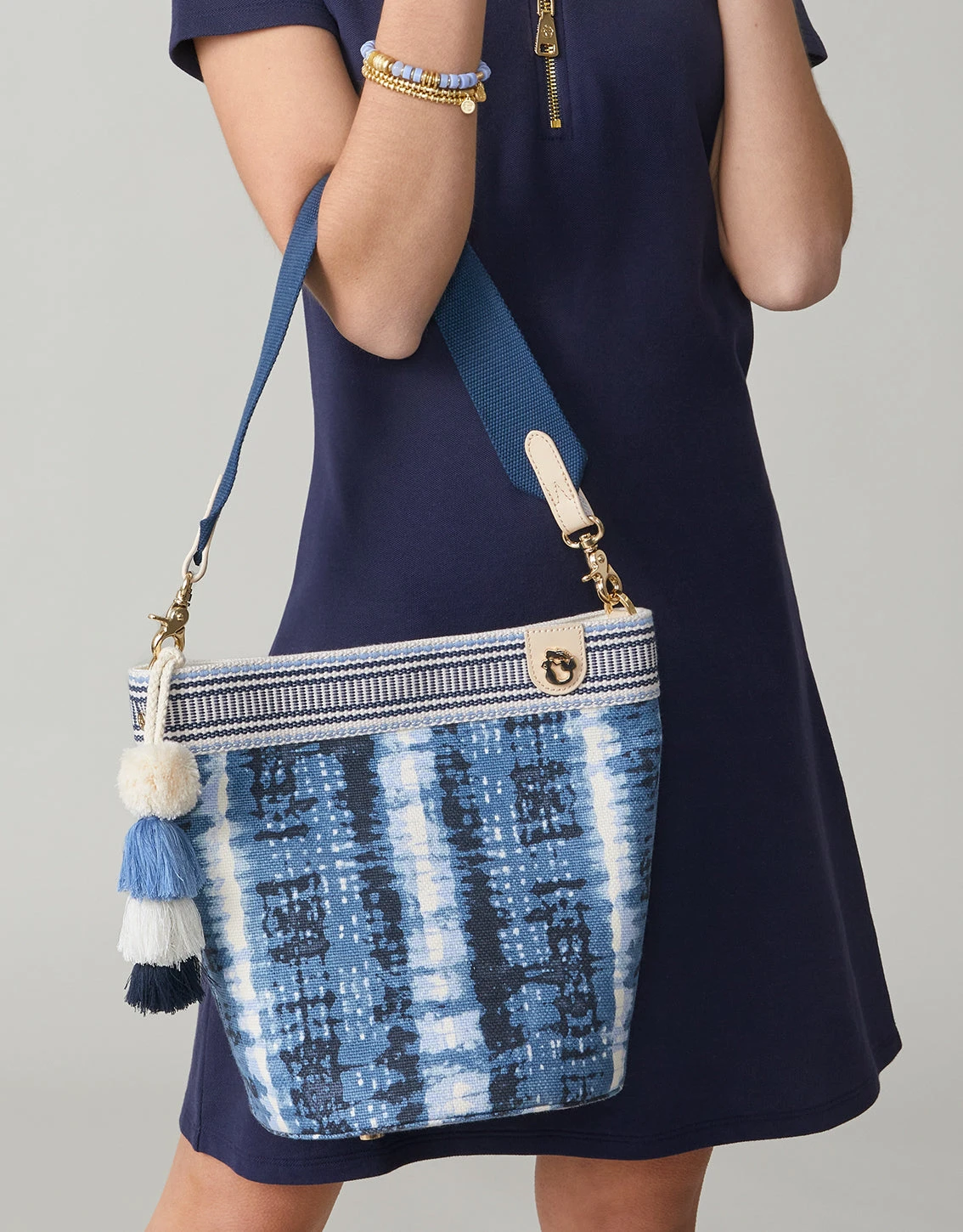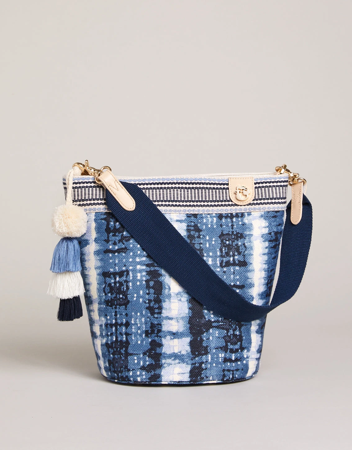 Workday or weekend, our Boho Bucket brings it. Awash in our tie dye pattern and trimmed with a beautifully embroidered band, the cotton strap (10-inch drop length) comfortably rests on your shoulder and the super-strong magnetic closure keeps contents where you put them. Inside is a zip and two slip pockets while the outside is dressed up with our large golden mermaid stud and gold foil leather patch.