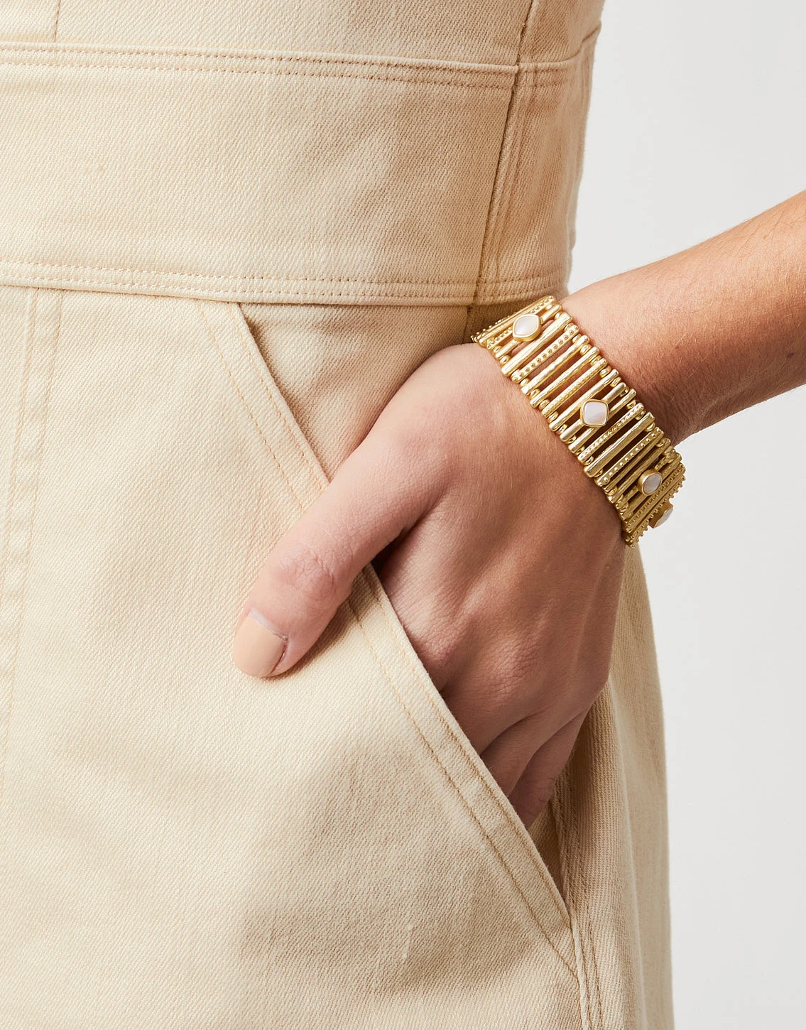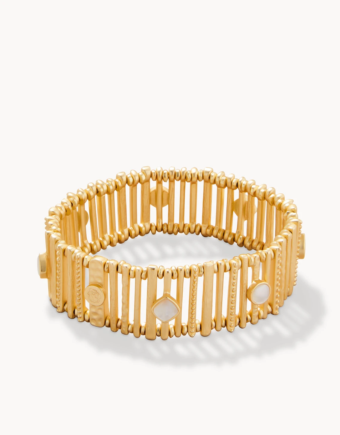 Your boho, coastal style shines through our Boho Maera Stretch Bracelet in Matte 18kt Gold Plating with shimmering Mother-of-Pearl and metal beads.