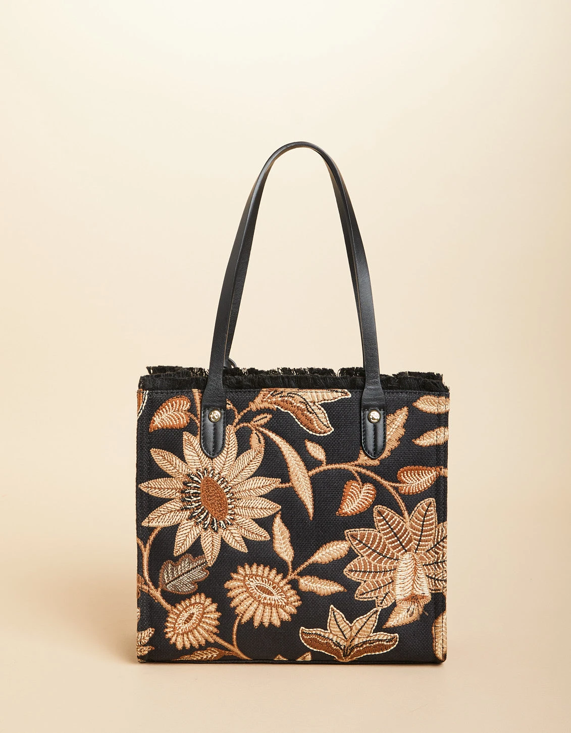 Gorgeous craftsmanship is all squared away in our Box Tote. Our floral embroidery surround this boxy beauty on all sides all while the tiered tassel fob keeps the look light. Leather shoulder straps and zip-top panel open to a linen interior, a zip and two slip pockets.