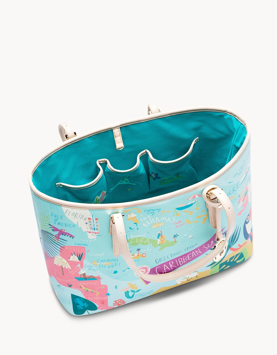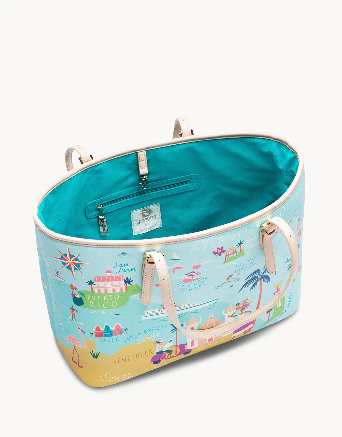 This tote with our signature golden Spartina logo is perfect for days of adventure shopping around town or relaxing on the beach. It features an open top design with a simple lobster claw closure, roomy interior plus three slip pockets and one zip pocket on the inside. The cotton canvas lining is brightly colored for fun, yet is also sturdy.