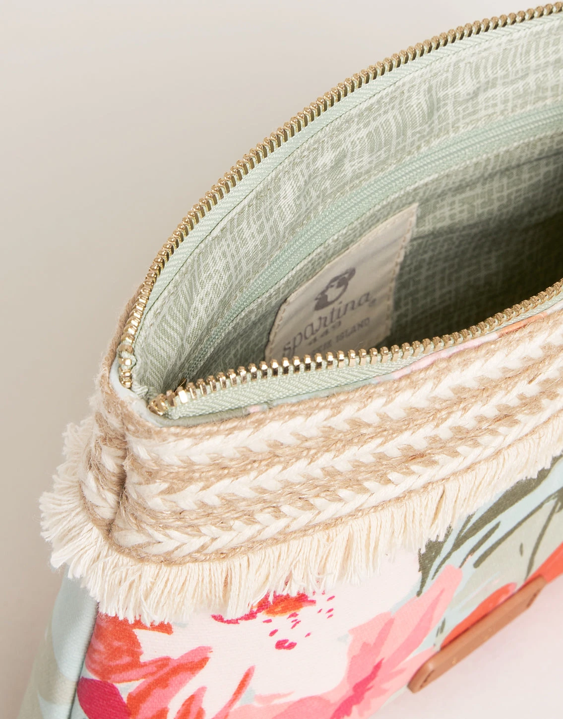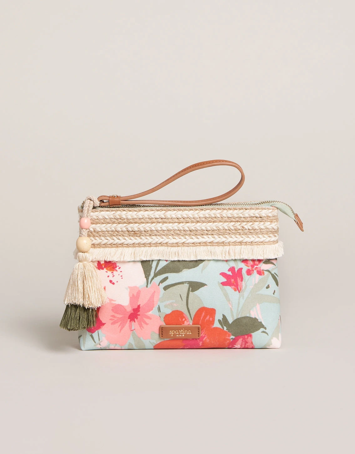 A beautiful tropical floral pattern is just the beginning to our splash-proof, stain resistant, laminated cotton Carina Wristlet, which features a faux leather wristlet strap, an easy, zip-top opening, a tiered tassel, wraparound fringe, plus an interior zip pocket.