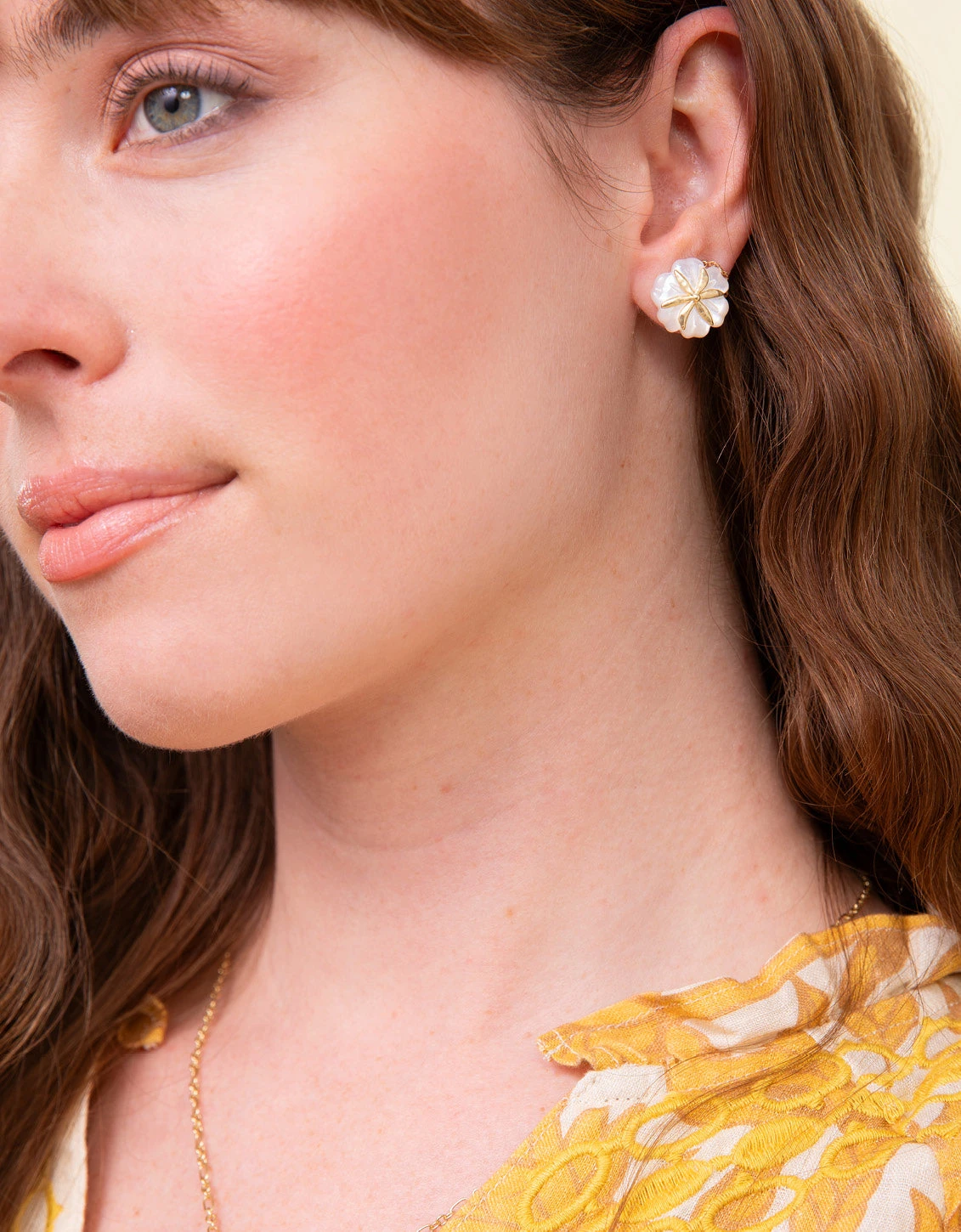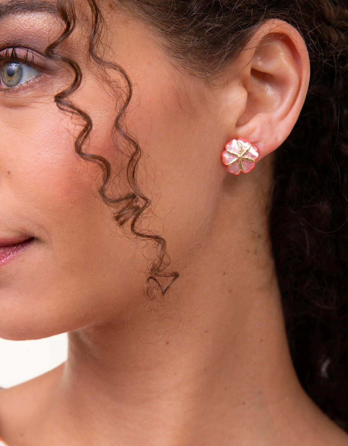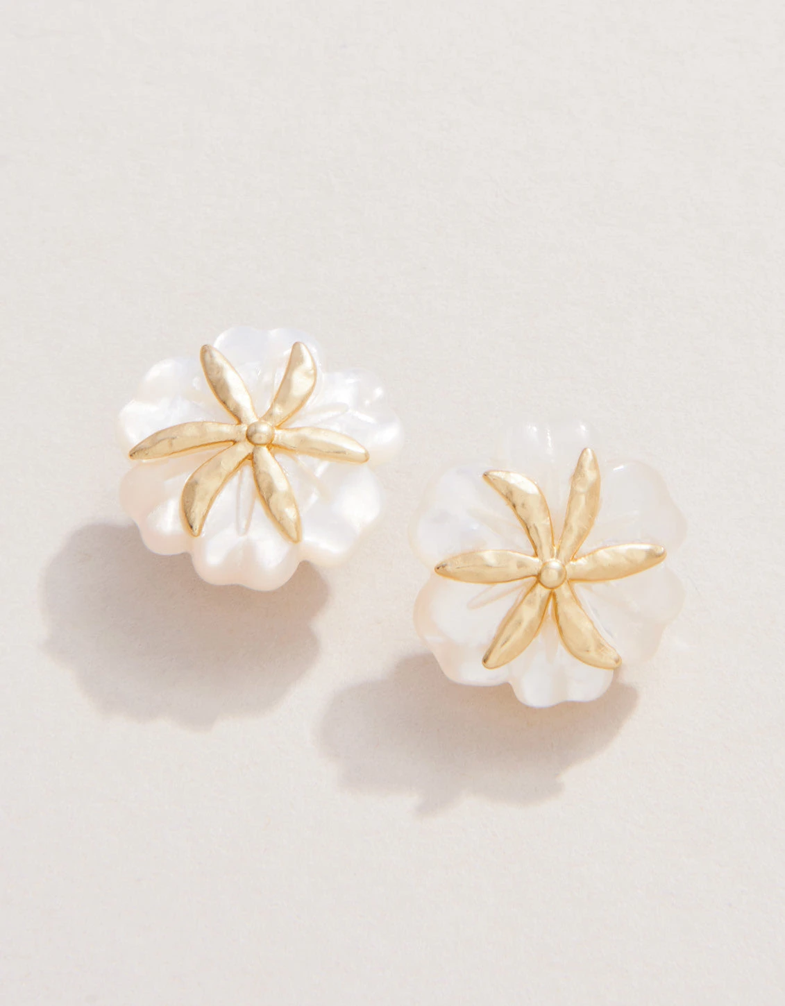 The flowers of our Carved Flower Stud Earrings are always fresh in a textured 18kt matte gold plating and shimmering mother-of-pearl. Dress up your look with these floral beauties.