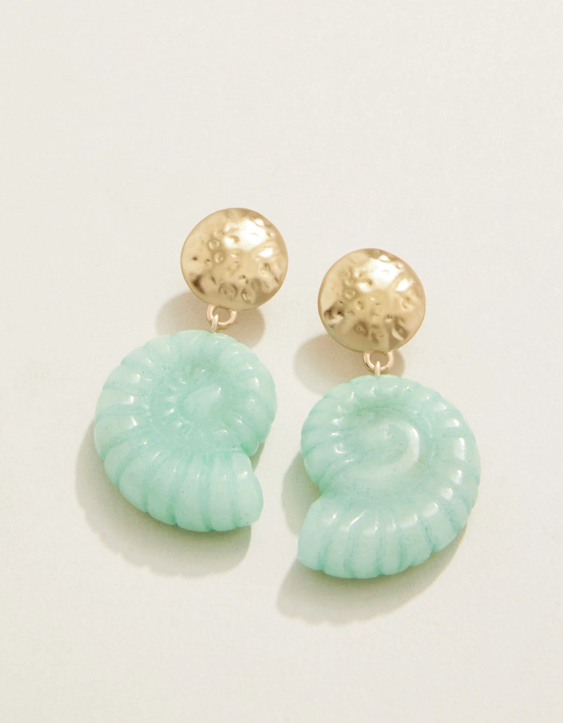 The ocean holds so many beautiful shells and creatures. We are spellbound with these mesmerizing Carved Moon Shell Earrings, featuring carved jade and 18kt matte gold plating.