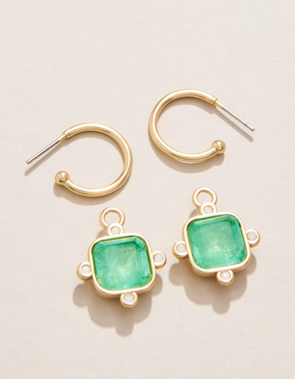 Our Chateau Convertible Hoop Earrings feature ocean green glass crystals intricately framed in 18kt matte gold plating and white opal glass crystals, dangling from lightweight golden hoops. Bonus, remove the drop for a simple gold hoop. 2-looks-in-1!