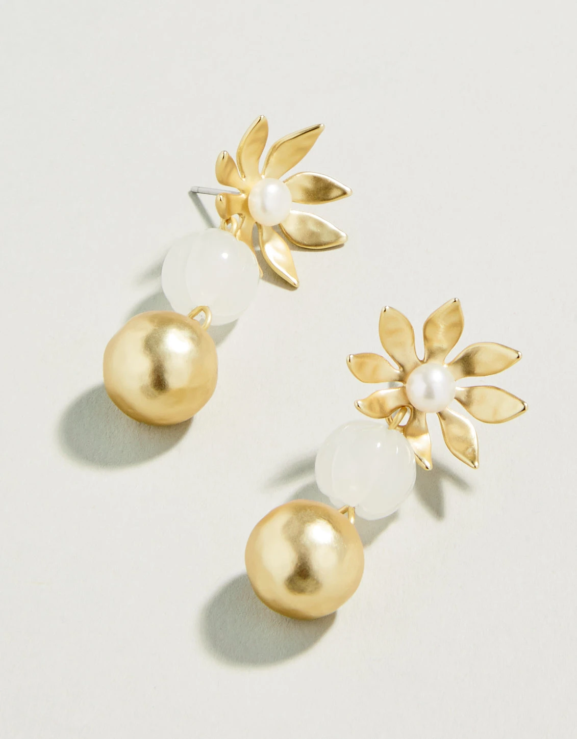 Make a statement with these 18kt matte gold plated Chestnut Earrings. Featuring golden flower petals clutching freshwater pearls while drops of white jade and textured gold dangle below.
