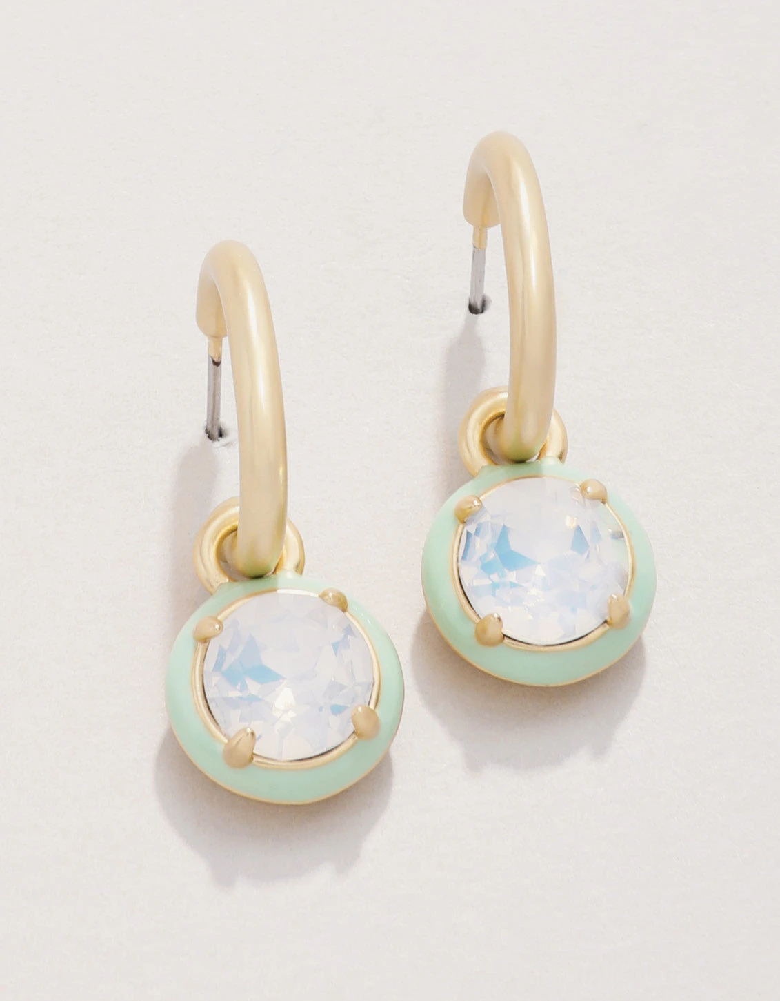 Our Clara Drop Hoop Earrings feature white opal glass crystals intricately framed in 18kt matte gold plating and enamel. Bonus: remove the stone drop for a simple gold hoop. 2-looks-in-1!