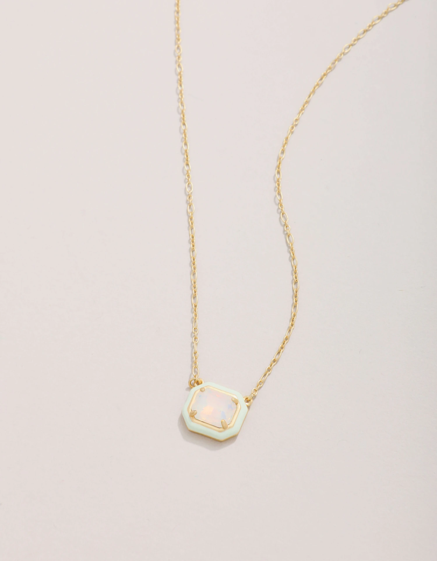 Our Clara Window Necklace features a white opal glass crystal intricately framed in 18kt matte gold plating and enamel. A timeless pendant you will be pulling out of your jewelry case again and again.