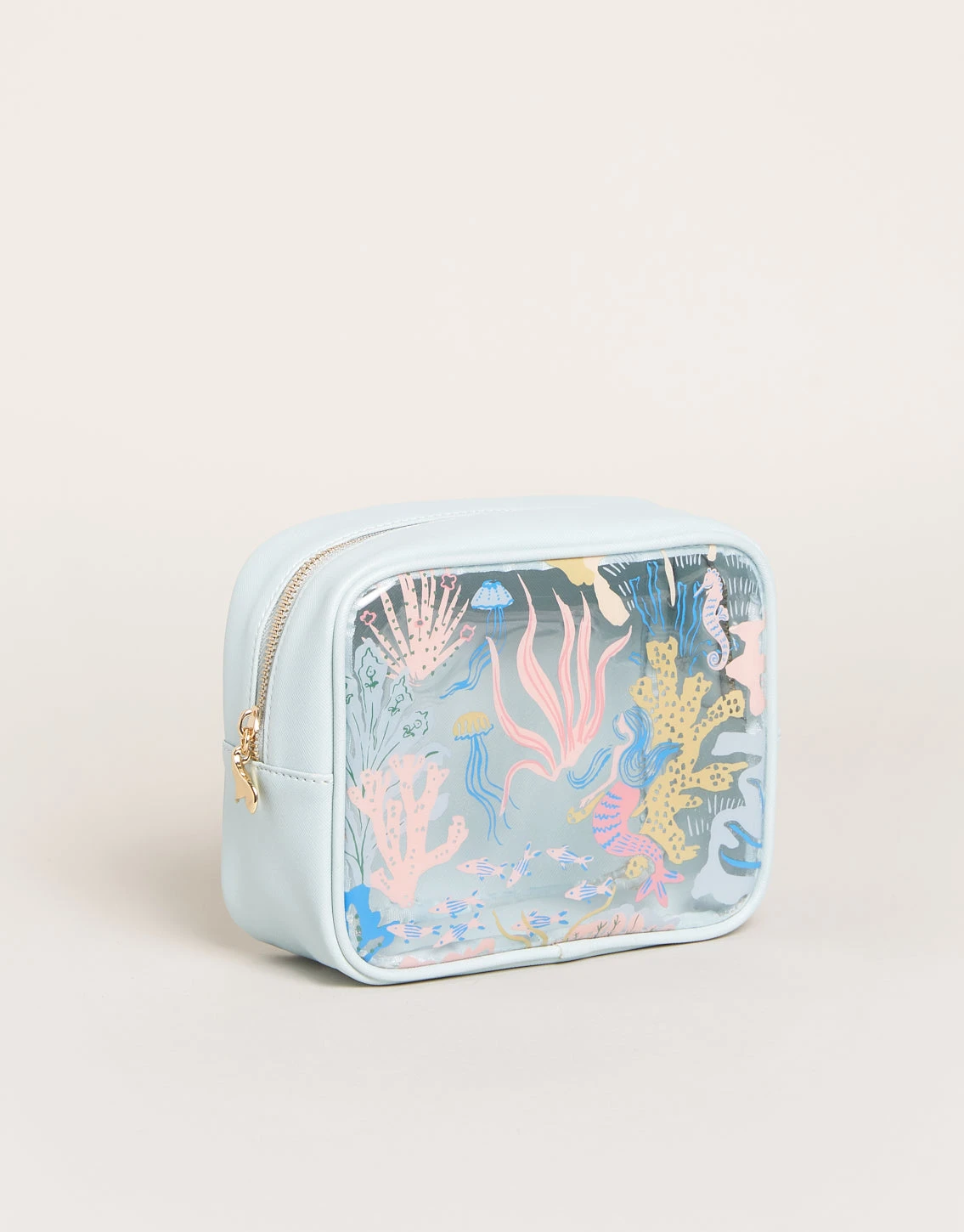 Practical and pretty, our Mermaid Sea Clear Travel Case goes wherever you go! Going through security, this see-through bag gets the all-clear from TSA while the back, interior pattern and mermaid tail zipper pull adds style to every mile.