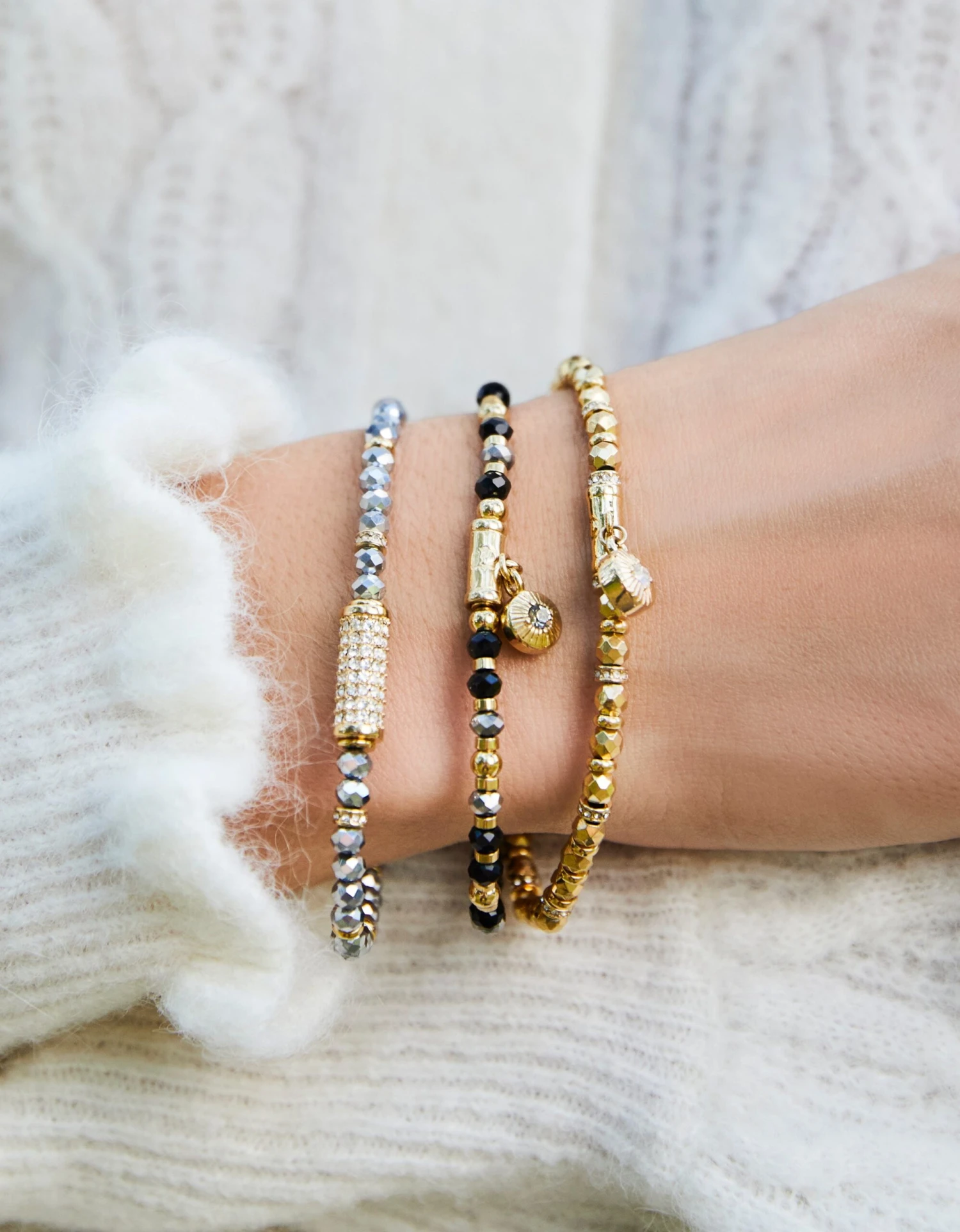Here is a bracelet you will never have to take off! Great for stacking or mixing and matching this easy-on stretch bracelet features sparkling gems and shiny glass beads. Designed to shine through everyday wear, exercise, showers and a summer at the beach in tarnish free 14kt gold vacuum plating.