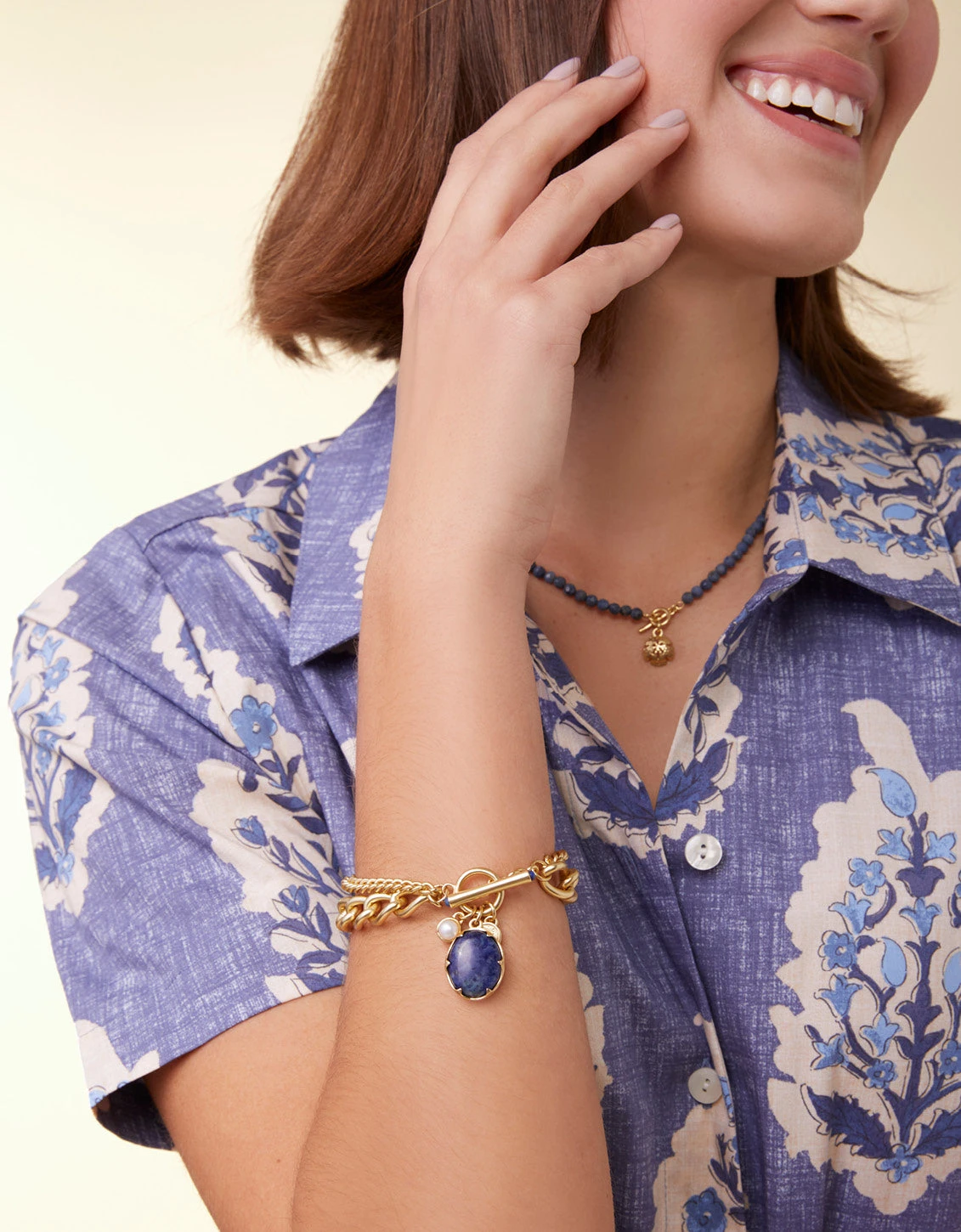 Drape your wrist in lustrous 18kt matte gold plated chains finished with a toggle closure and an exquisitely set natural blue stone charm. This Coralie Toggle Bracelet will have you feeling anything but blue. Please note: This design features natural stones and each piece is one-of-a-kind. Colors and patterns may vary slightly from the image shown.