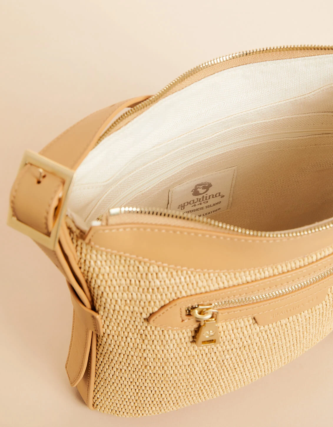 This gorgeous straw transitional piece is complemented by top grain Napa leather. Open the zipper of our Crossbody to 2 slip pockets and 1 zipper pocket. Plus, there is a convenient exterior zipper pocket.