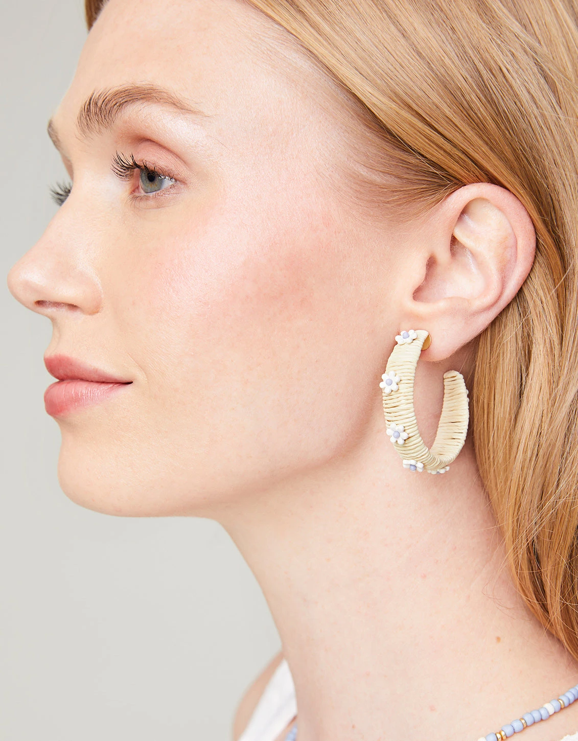 Wear the Lowcountry’s Spring blooms on your ears in our Daisy Straw Hoop Earrings, made of 18kt matte gold plating, enamel coated flowers and wrapped in straw.