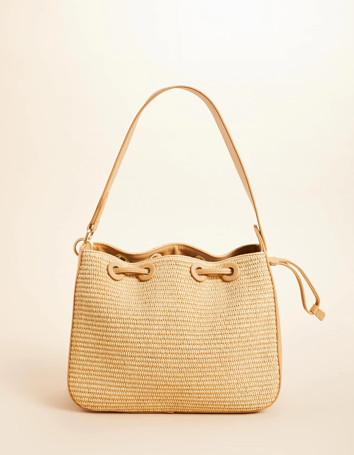 Our new Drawstring is simple, yet sophisticated in a straw and top grain Napa leather. Wear the thick leather strap over your shoulder and let this Drawstring take you from the coast to the mainland and back! Open the drawstring to find 2 slip pockets and a zipper pocket.
