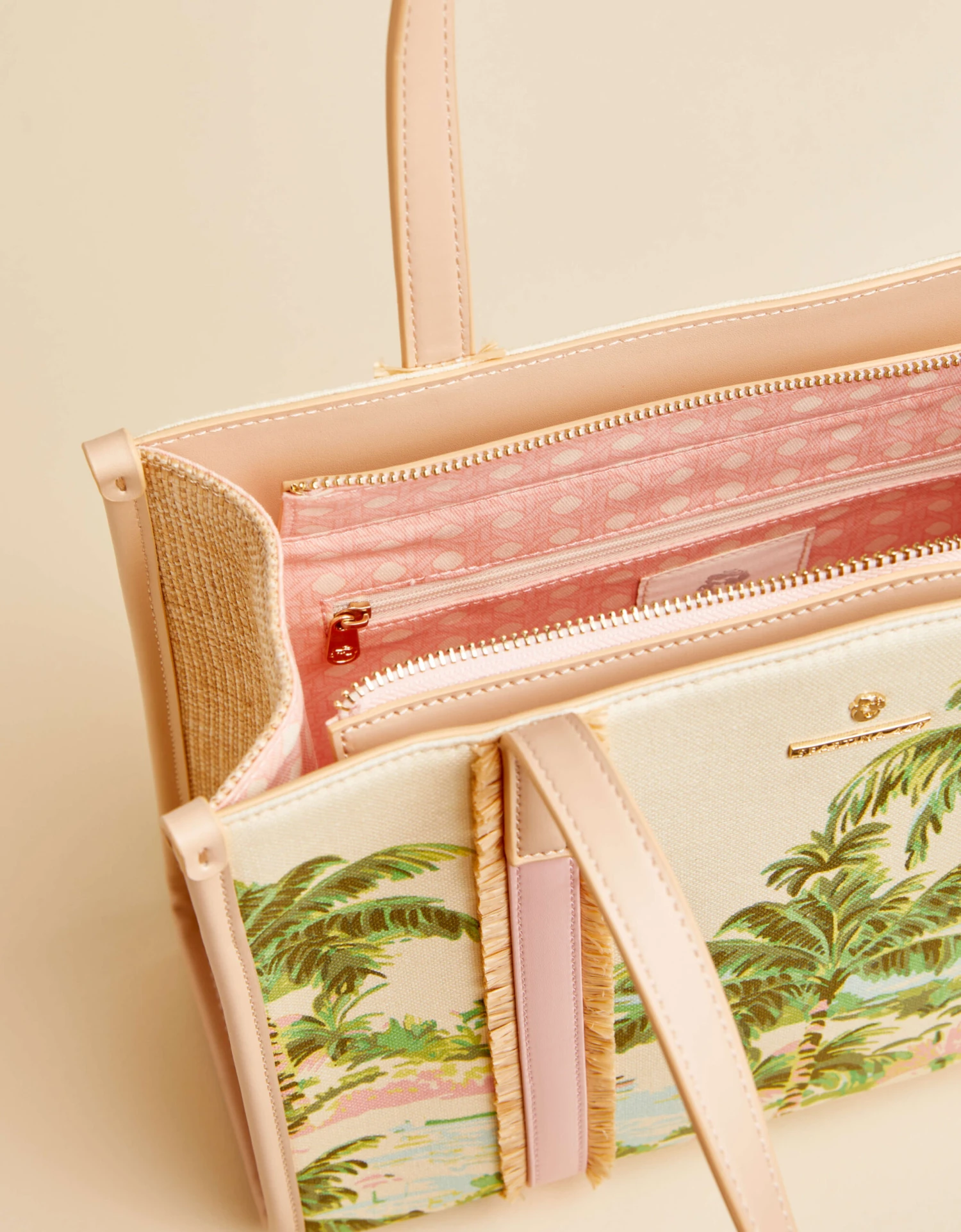 Gorgeous craftsmanship is all squared away in our Dune Tote. Our coastal dreams printed linen and cotton surrounds this boxy beauty while the faux straw fringe adds fun texture. Faux leather shoulder straps and zip-top panel open to a cotton interior, a zip and 2 slip pockets.