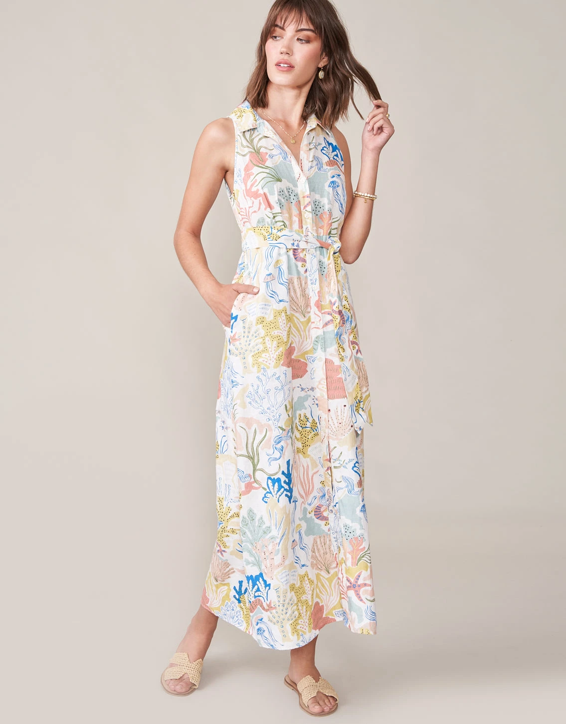 Our sleeveless collared Emeline Dress may call for a stroll past the wildflowers, but you’ll want to wear it to the bridal brunch, to Shakespeare in the park, and to every porch party all spring and summer long. it’s easy to see why: a flattering collared neckline with faux shell summarys down the center and self-tie belt, fabulously functional hidden pockets, and a midi length.