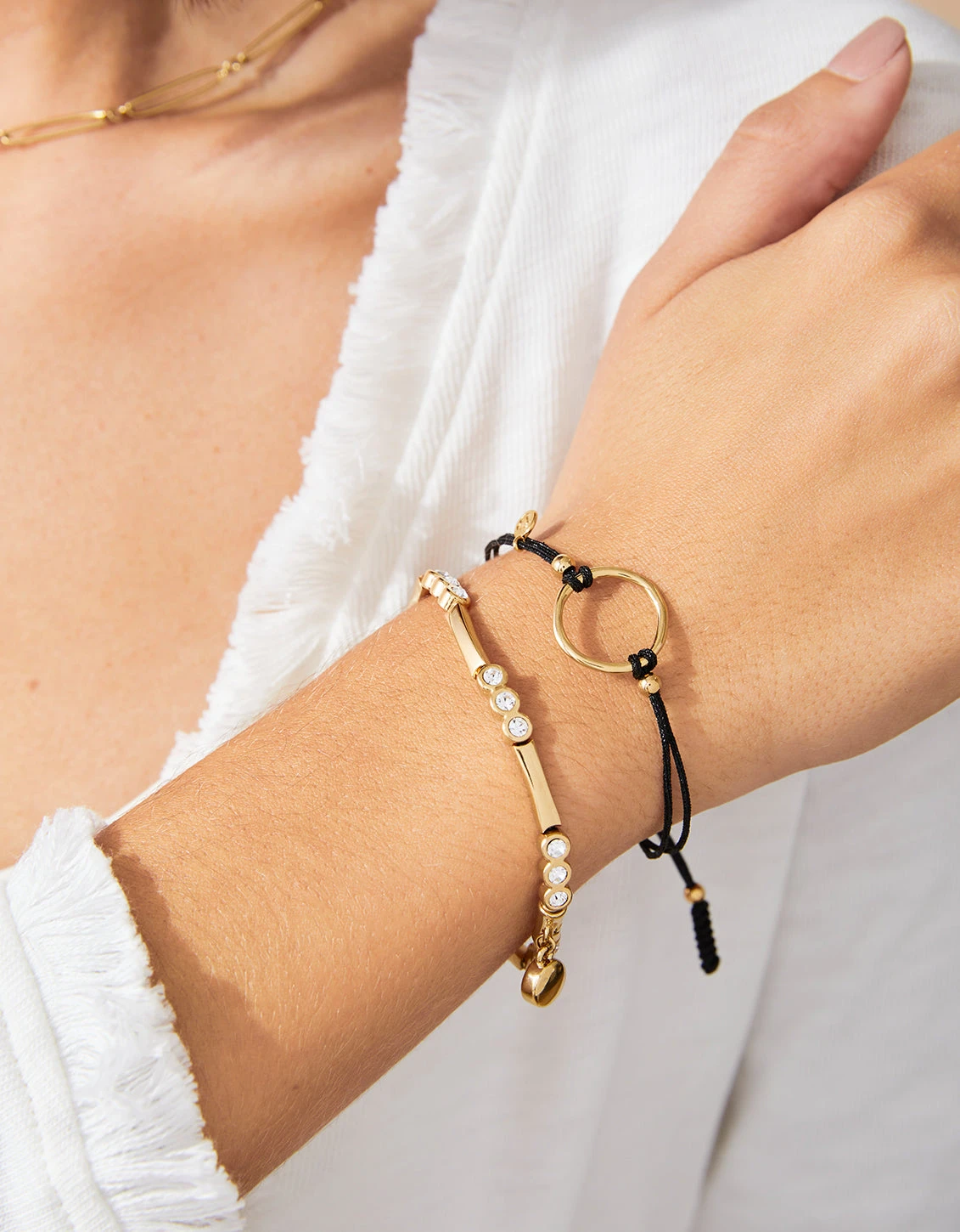 Made of tarnish free, water resistant 14kt shiny gold plating over stainless steel, the Endless Slide Bracelet features a warm, golden ring studded with glass crystals on a nylon rope made to slide to the perfect fit. This is a bracelet you will never have to take off, designed to shine through everyday wear, exercise, showers and a summer at the beach.