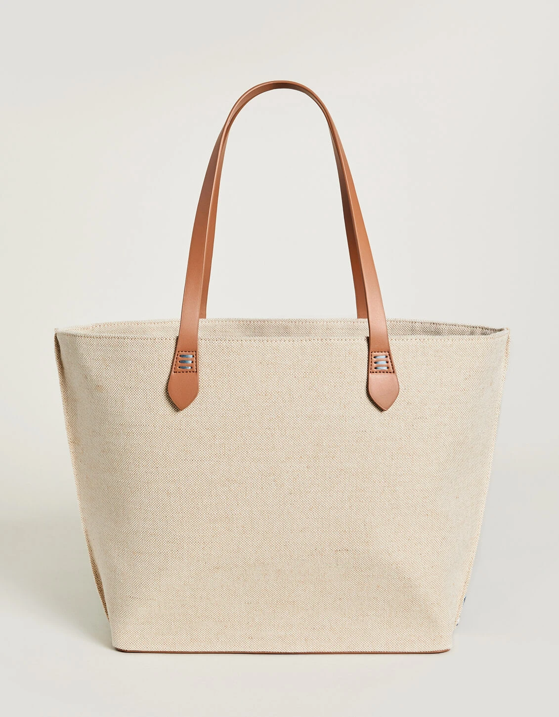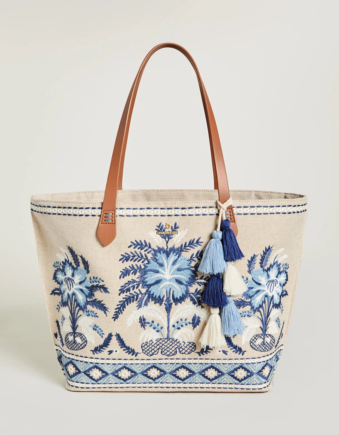 The best party is a beach party and our Fiesta Tote is always ready to come along! Decorated with palm tree embroidery on a cotton and jute blend, this tote features a fun, tiered tassel fob and a faux leather bottom base to keep it dry. The custom patterned cotton interior features 2 slip pockets and 1 hanging zipper pocket.