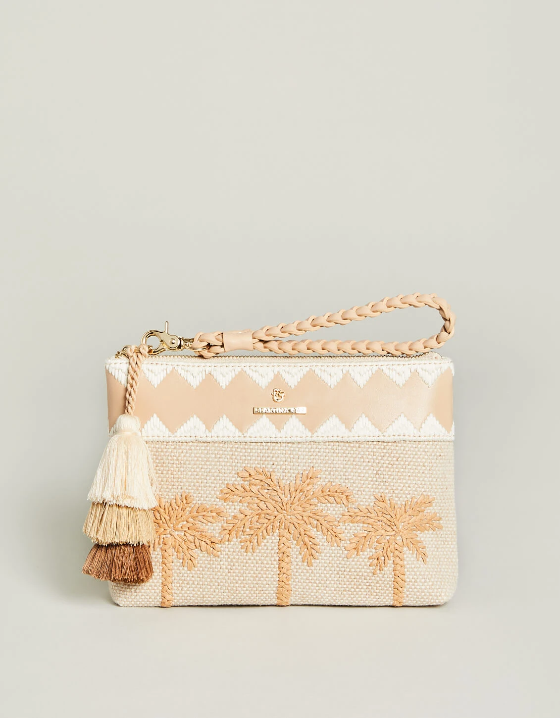 For its petite size, our papyrus embroidered palm beach, woven jute Maci Wristlet certainly get its share of attention thanks to its gorgeous details: a double-tassel statement fob, an embroidered woven band and a faux leather braided wristlet strap. The interior has plenty of space to hold your essentials.