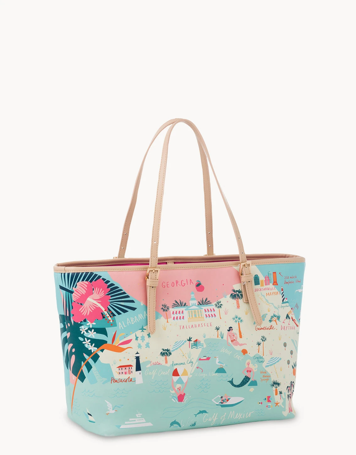 This tote with our signature golden Spartina logo is perfect for days of adventure shopping around town or relaxing on the beach. It features an open top design with a simple lobster claw closure. A roomy interior includes three slip pockets and one zip pocket. The cotton canvas lining is bright and fun, yet is also sturdy.