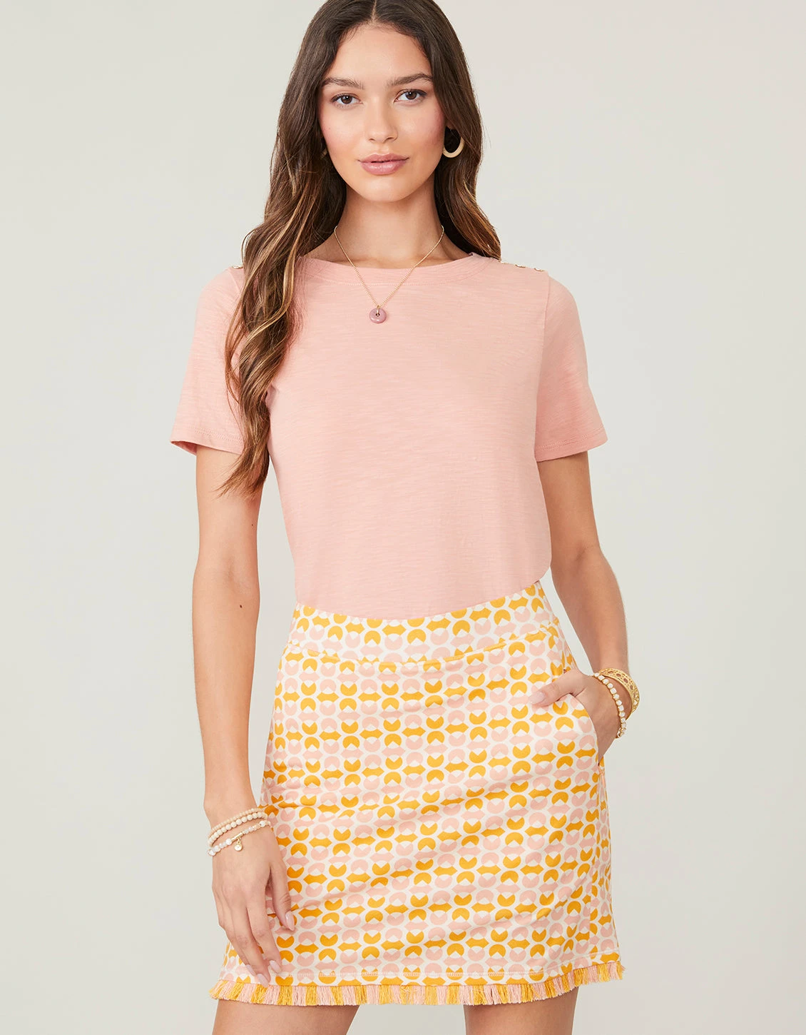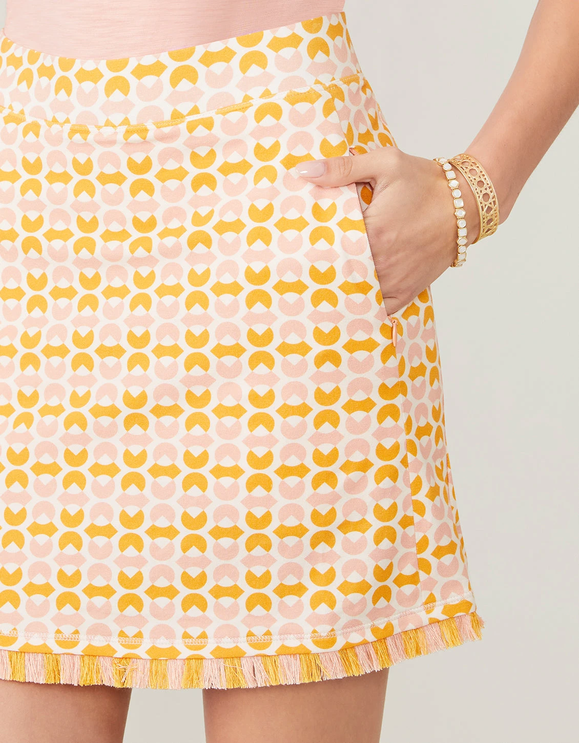 Get the look of a sporty mini skirt with all the invisible coverage of a short. Ready to pair with golf shoes, canvas sneakers or your favorite sandals. With a fun, two-toned fringe at the bottom hem, this modern geometric pattern stands out.