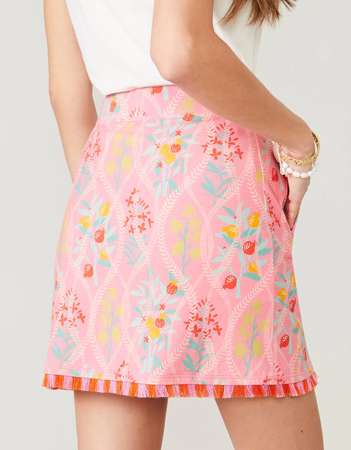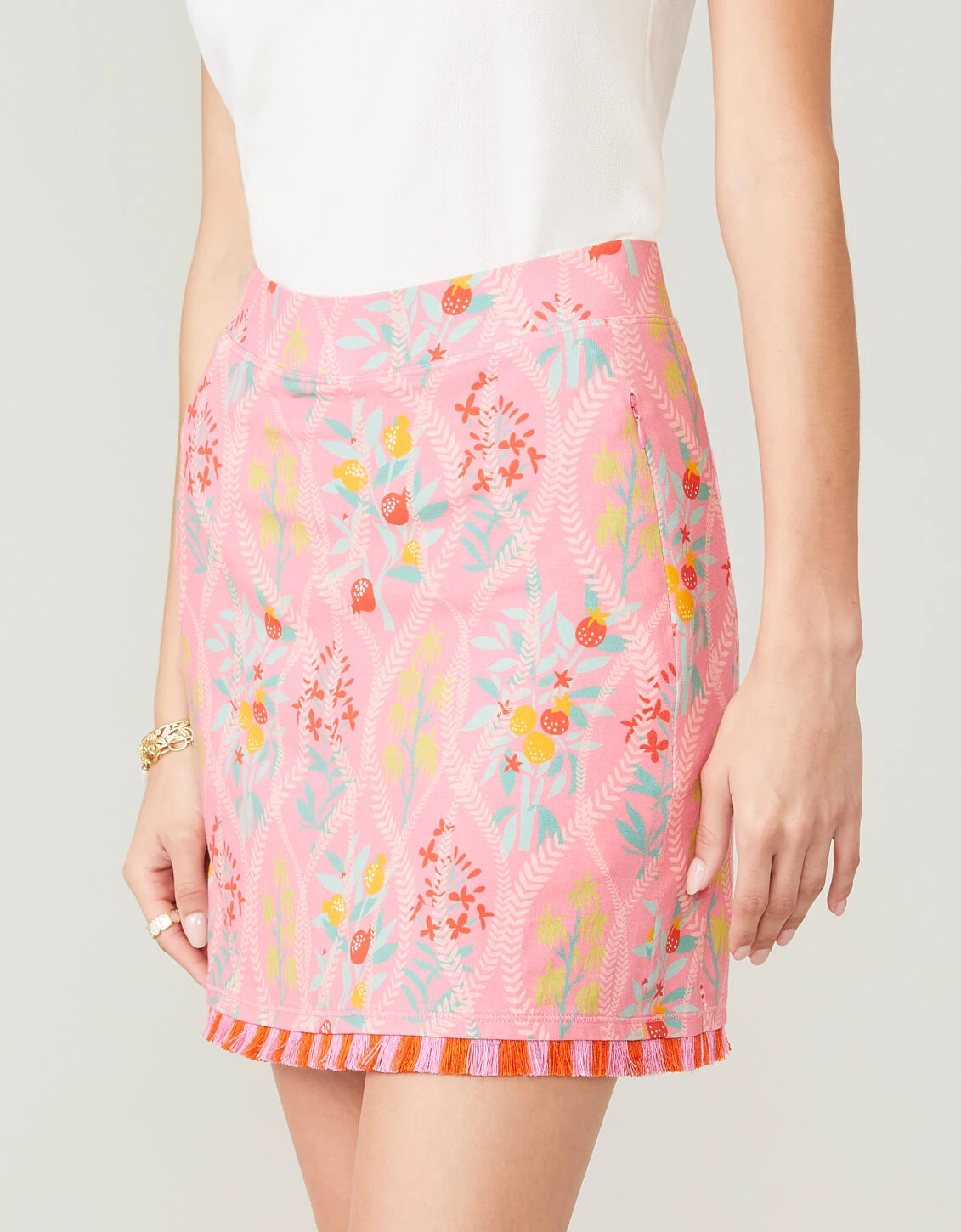 Get the look of a sporty mini skirt with all the invisible coverage of a short. Ready to pair with golf shoes, canvas sneakers or your favorite sandals. With a fun, two-toned fringe at the bottom hem, this tropical floral pattern stands out!