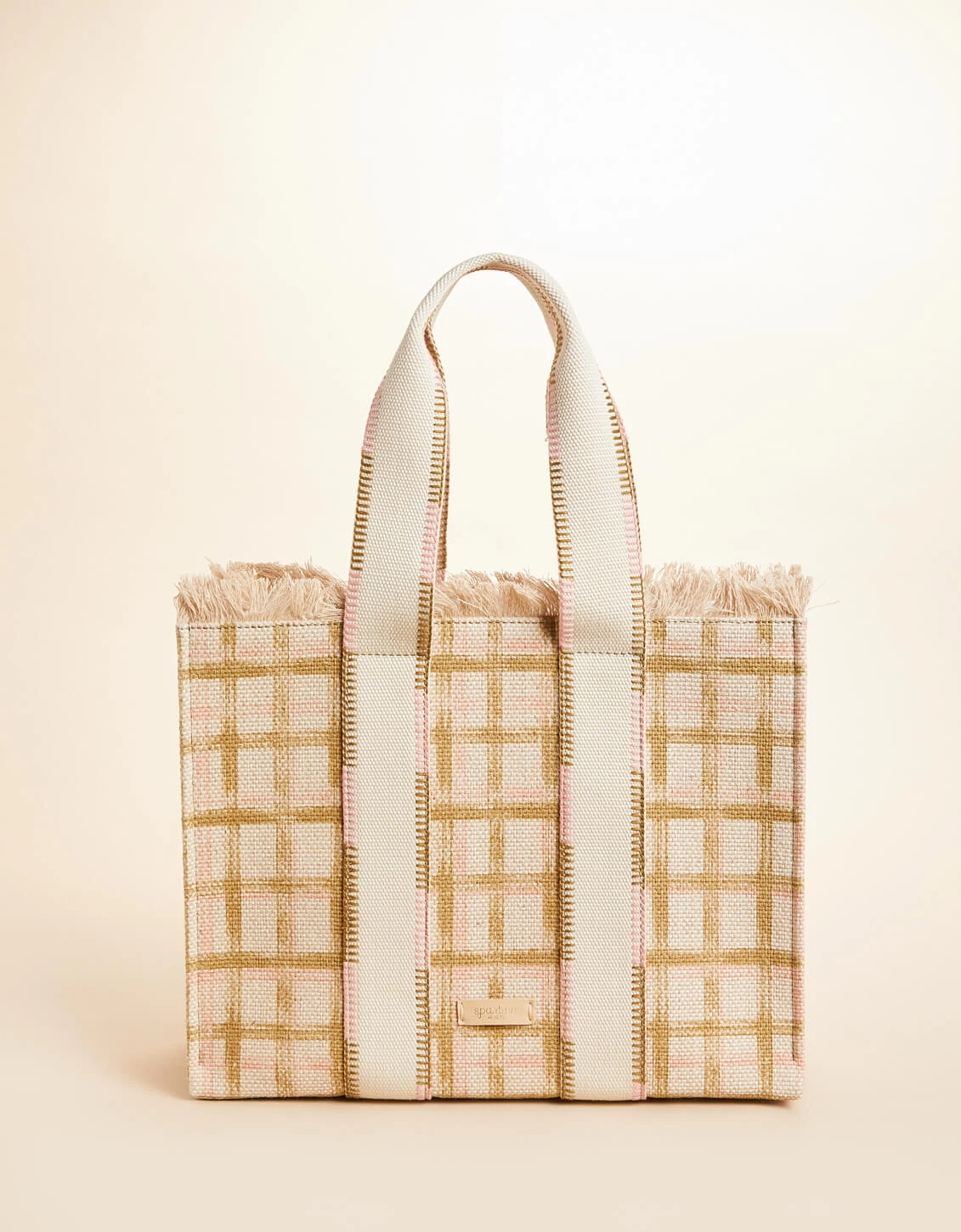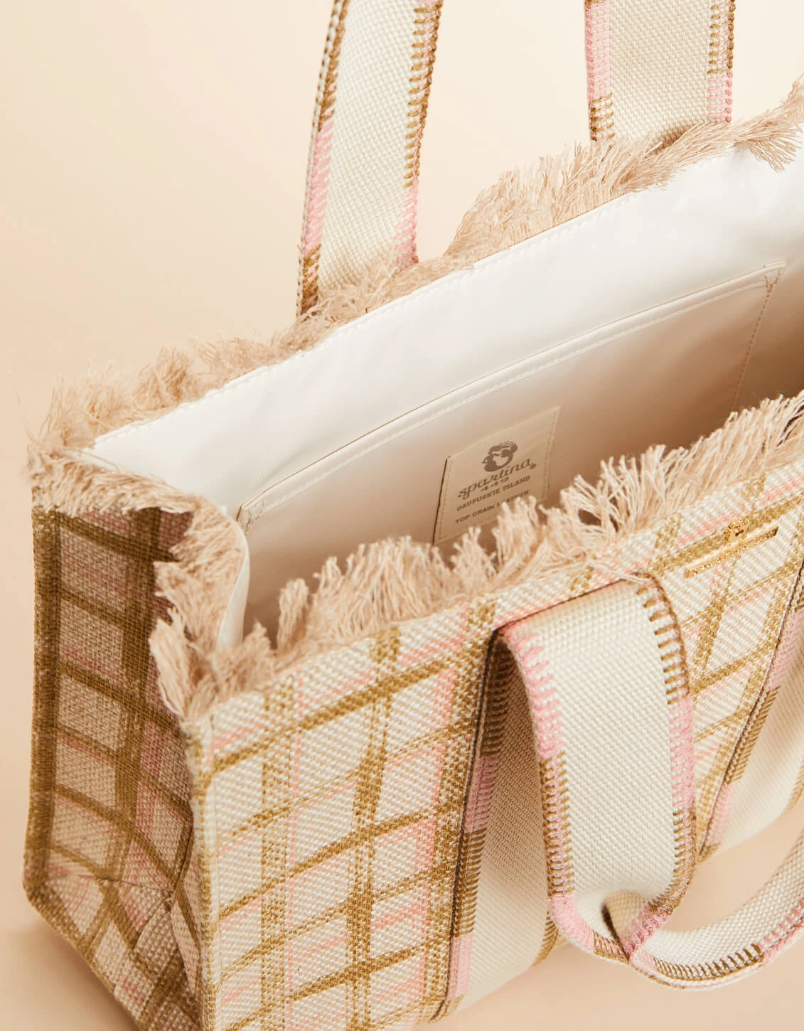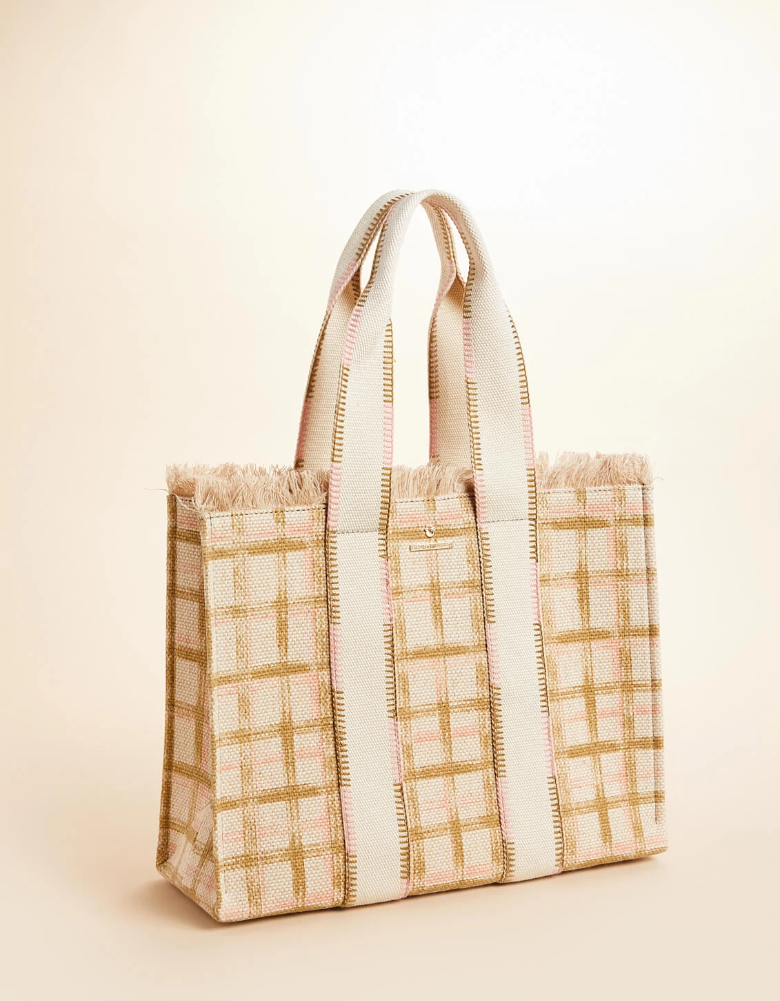 Made in a luxurious cotton and jute blend, our Fringe Tote boasts a gorgeous pink and neutral plaid to transition you into Spring. Inside its open top, you’ll find a slip pocket in this medium size and roomy tote.