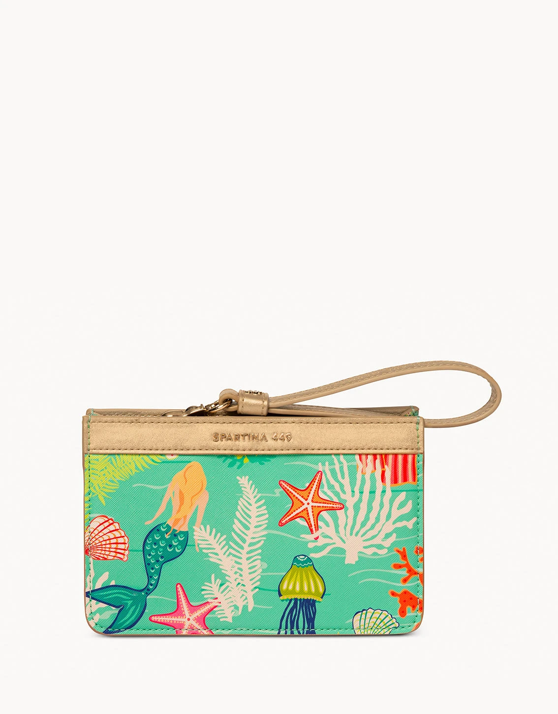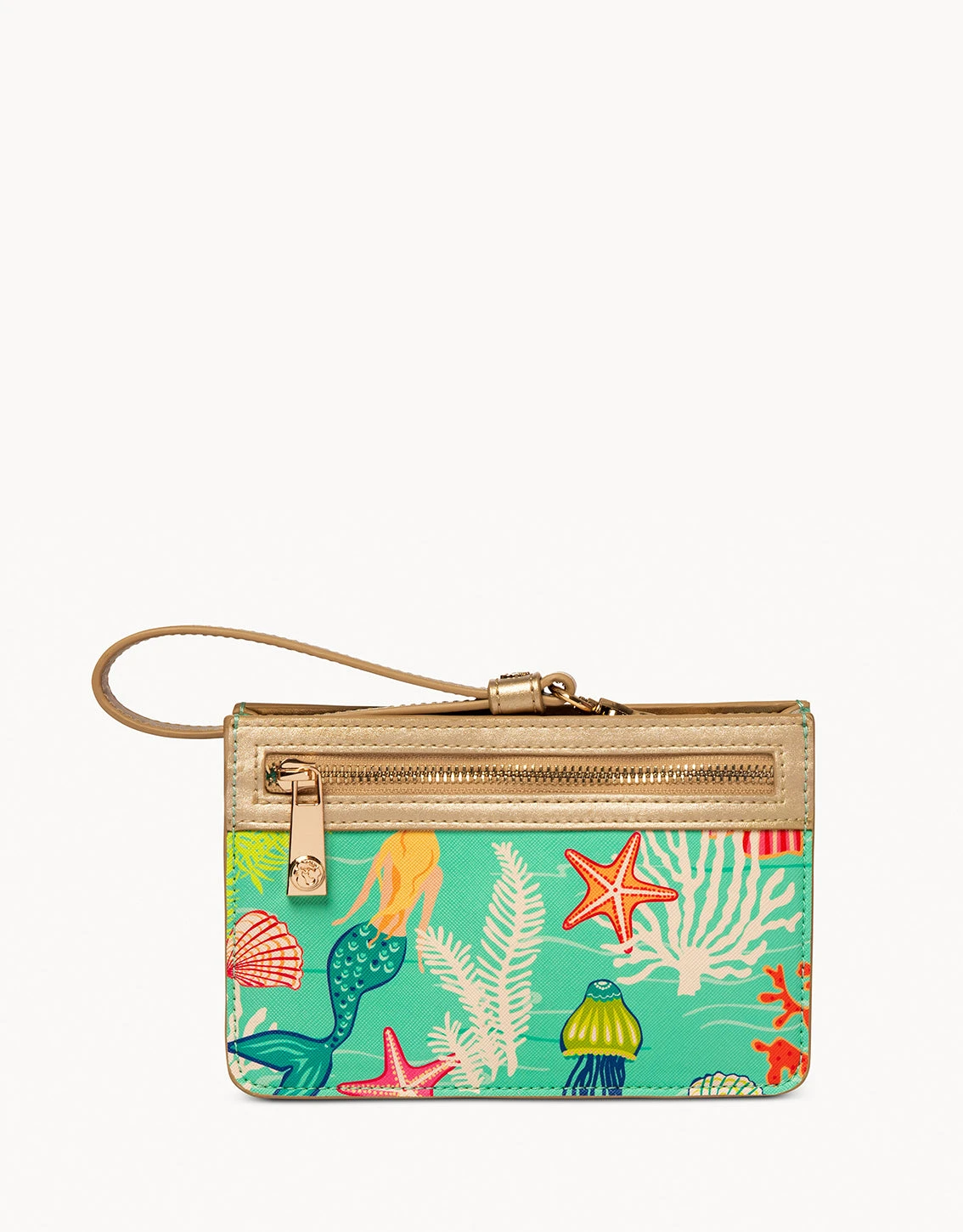 Totally on trend, this tri-shaped Golden Mermaid Wristlet can stand on its own. A zip pocket on the back exterior complements the golden, mini mermaid stud and foil lettering on the detachable faux-leather wrist strap. Unzip and you’ll find all the essentials for your essentials: 3 card slots, a zip pocket, plus plenty of room for your phone, keys, whose-its and what’s-its.