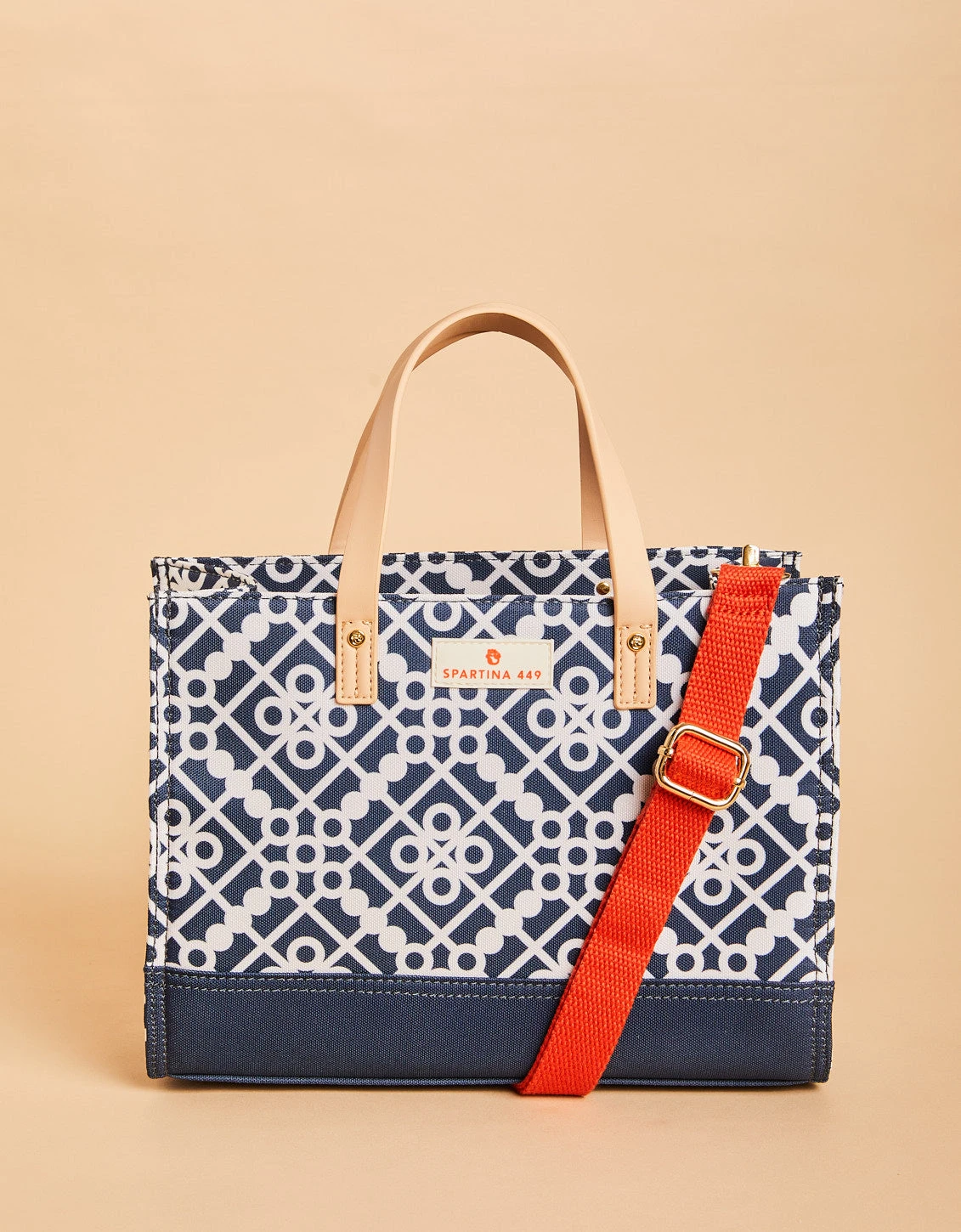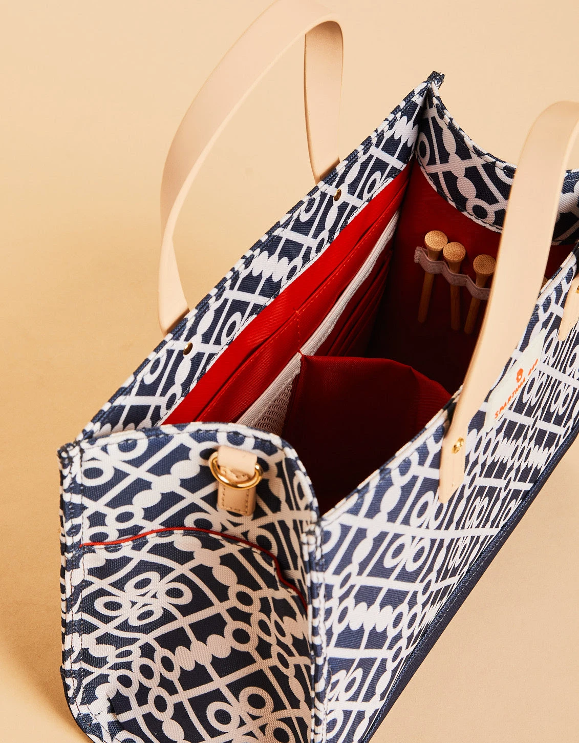 Made for the course, our Golf Crossbody Tote fits perfectly in your cart basket in easy-to-clean nylon. The adjustable and removable crossbody strap plus the top handle make the tote easy to grab on-the-go. The outside features slip pockets and a removable ball marker fob, while the inside features 5 slip pockets, 3 elastic mesh pockets, 3 card slots with RFID protective lining, and 5 elastic tee holders.