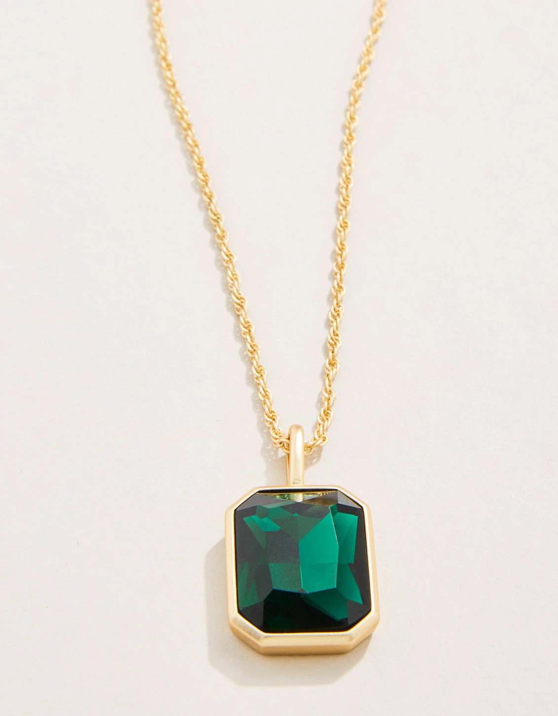 Our Grand Chateau Necklace features a dark green glass stone intricately framed in 18kt matte gold plating. A colorful classic you will be pulling out of your jewelry case again and again.
