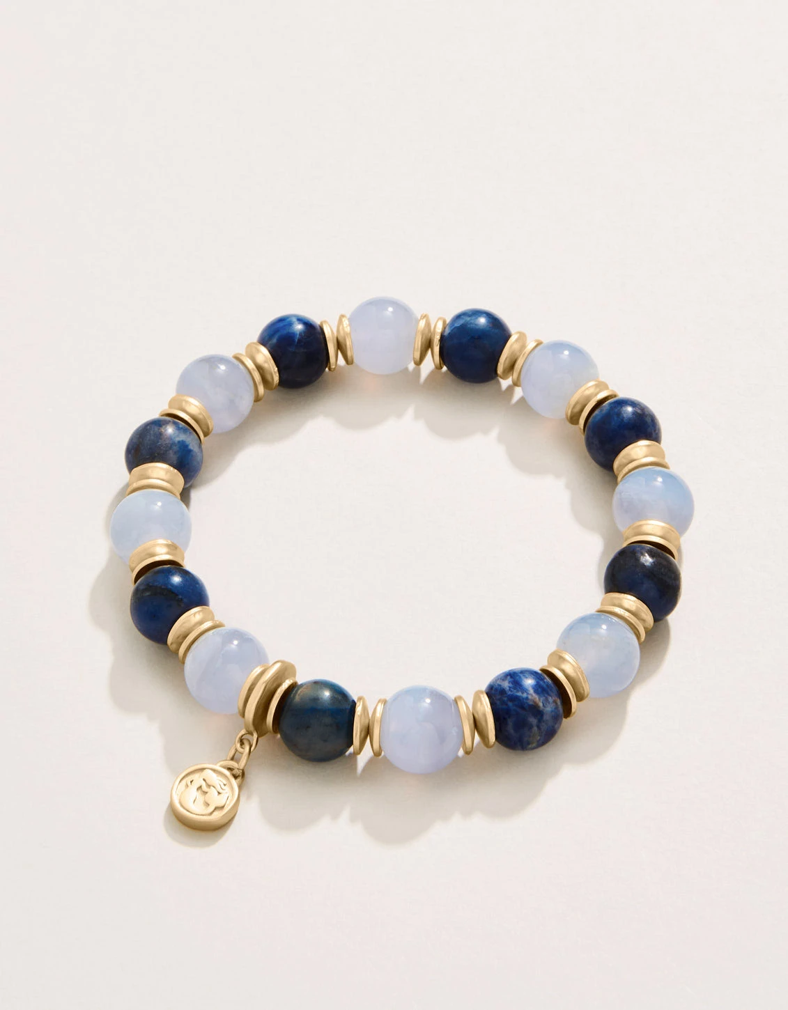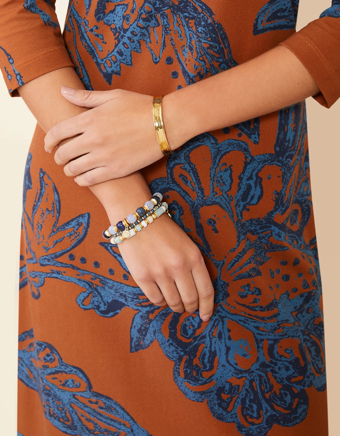 There is no denying this timeless classic, in 18kt matte gold plating our Grand Stone Stretch Bracelet adds a punch to any bracelet stack featuring natural stone and metal beads. You will be reaching for this slip-on classic again and again. Please note: This design features natural stones and each piece is one-of-a-kind. Colors and patterns may vary slightly from the image shown.