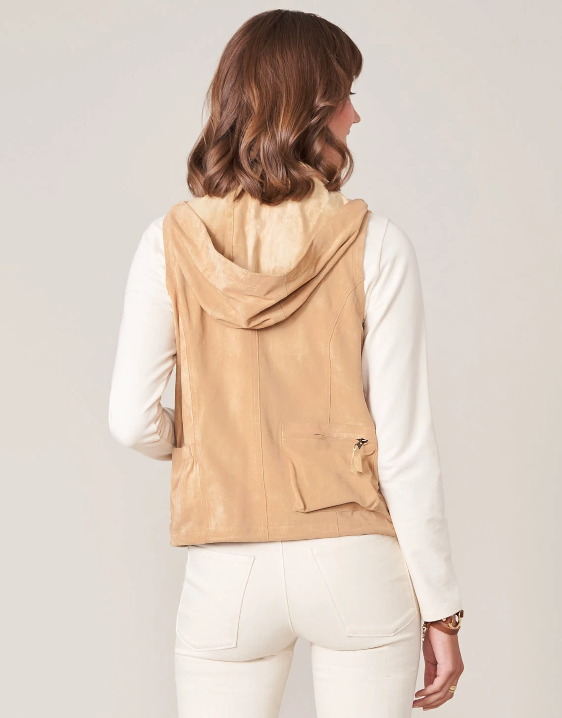 Layer on the luxury in the exceptionally soft, unlined, premium washed suede lambskin leather Greta Vest – the effortless way to transition from one season to the next. This chamois suede leather vest ups your season’s style.