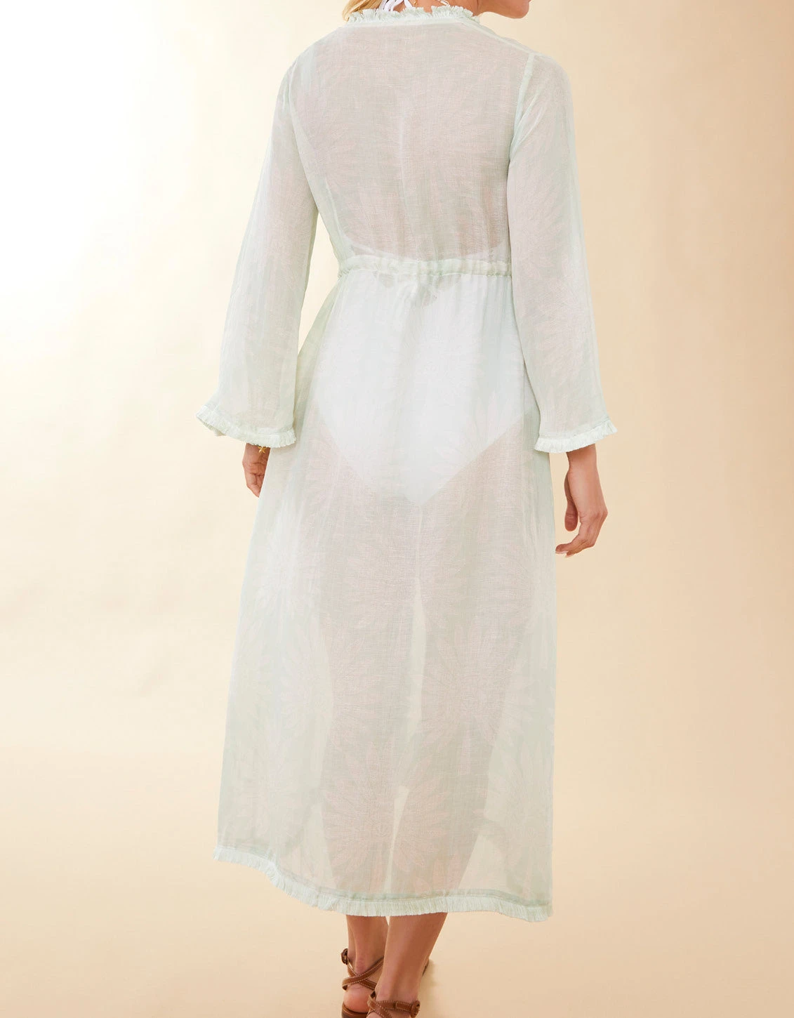 Resort ready? Our Gretchyn Beach Cover Up is. Cinch the waist with the drawstring ties or wear open to show off your suit in this palmetto patterned, midi-length style. Accented with a deep v-neck and long bell sleeves, this cover up is photo-ready whether you’re poolside or taking in a boat day.