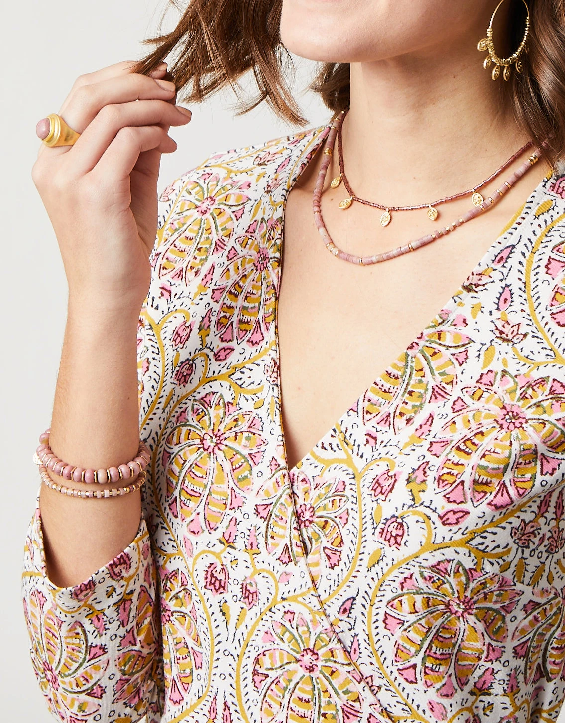 Your boho, coastal style shines through our Harmony Beaded Necklace in Matte 18kt Gold Plating with its natural Pink Rhodonite stone beads for a unique look. Please note: This design features natural stones and each piece is one-of-a-kind. Colors and patterns may vary slightly from the image shown.