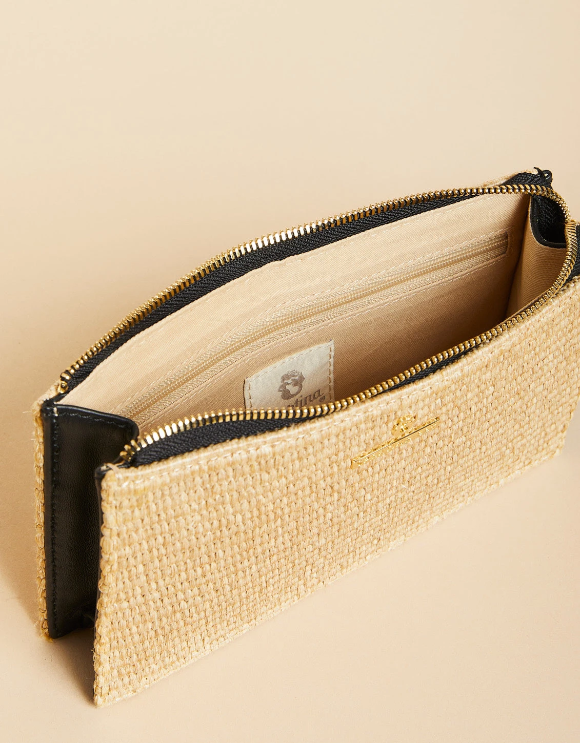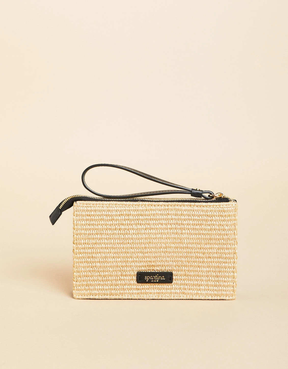Black napa leather accents complement the neutral straw base of our Kai Straw Wristlet. It features a hanging palm leaf fob with a zip-top that opens to 3 cards slots and a zipper pocket.