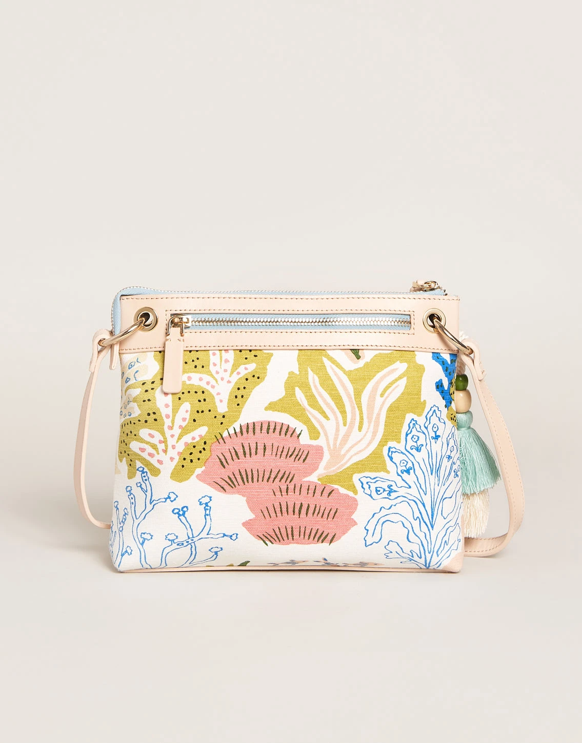 For evenings, weekends and everything in between, the Keira Crossbody is crafted for fun, ease and comfort. The adjustable leather crossbody strap is fastened securely with golden hardware to this coated textured vinyl hipster with a golden Spartina logo on the front side. The top zips closed and there is a handy back exterior zip pocket. Inside there are two slip and one zip pocket housed in a cotton lining. Plus, that fun fringe tassel!