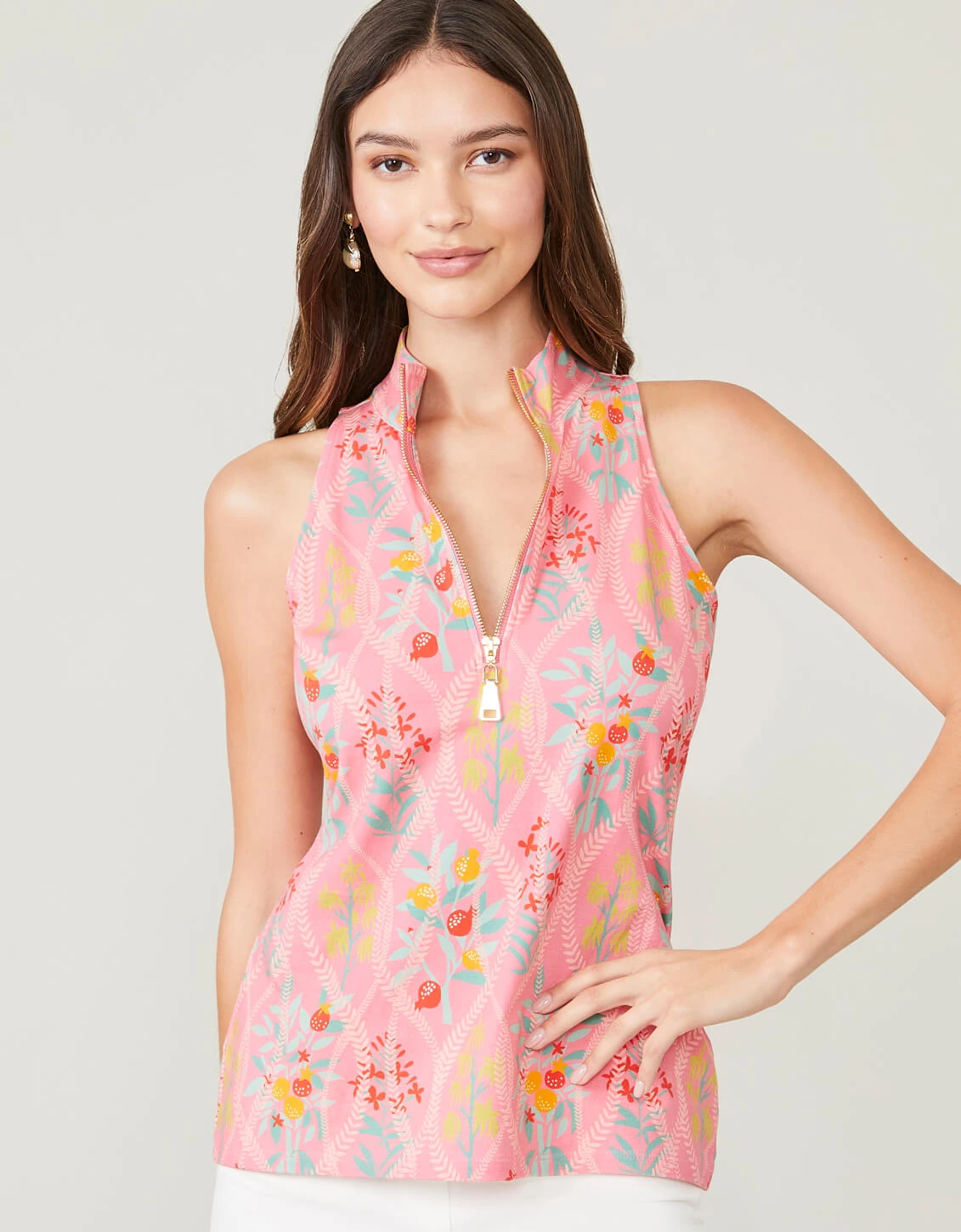 Our sleeveless, racerback Keira Zip Tank was made for those chilly mornings that turn into warm afternoons, whether you’re hitting the green or enjoying brunch with the girls! Its half-zip zipper add even more style to this soft, Peruvian cotton tank! The Queenie Topiary Pink color coordinates perfectly with our Fringe Skorts and the Maren Pull on Pants!