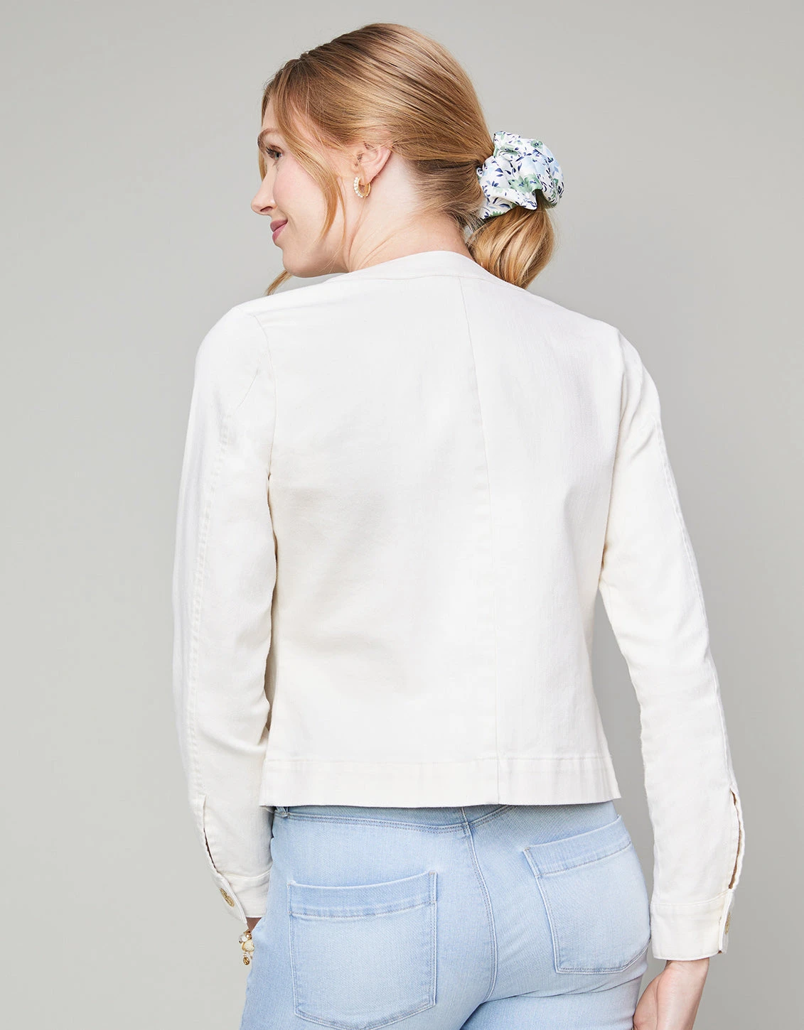 Wear our Kinsley Denim Jacket all year long. Front flap pockets and gold logo summarys give textured style and functionality to this stretch denim jacket that layers perfectly atop sheer or sleeveless tops. Wear across collections as this neutral women’s off-white denim jacket playfully pairs with bold prints and keeps your look balanced.