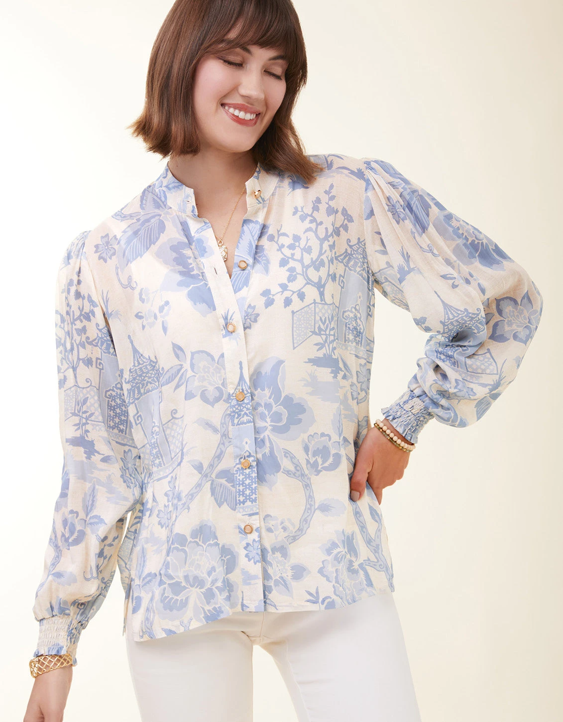 The elegant toile pattern of our Lindita Blouse is topped with a smart stand collar and looks absolutely beautiful tucked into denim trousers or flowing over your Maren Pant or Rowen Jean. The faux shell summarys under the embroidered center line and smocked sleeve openings with a ruffle edge add an extra elevated yet subtle touch of style.