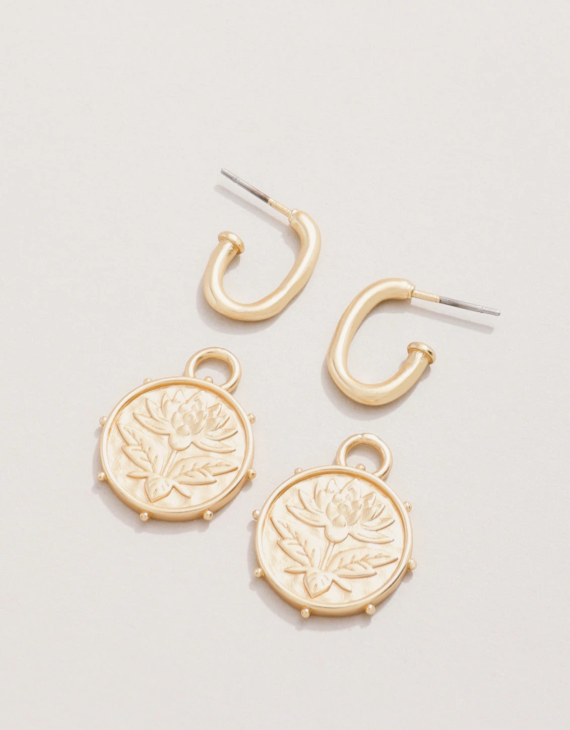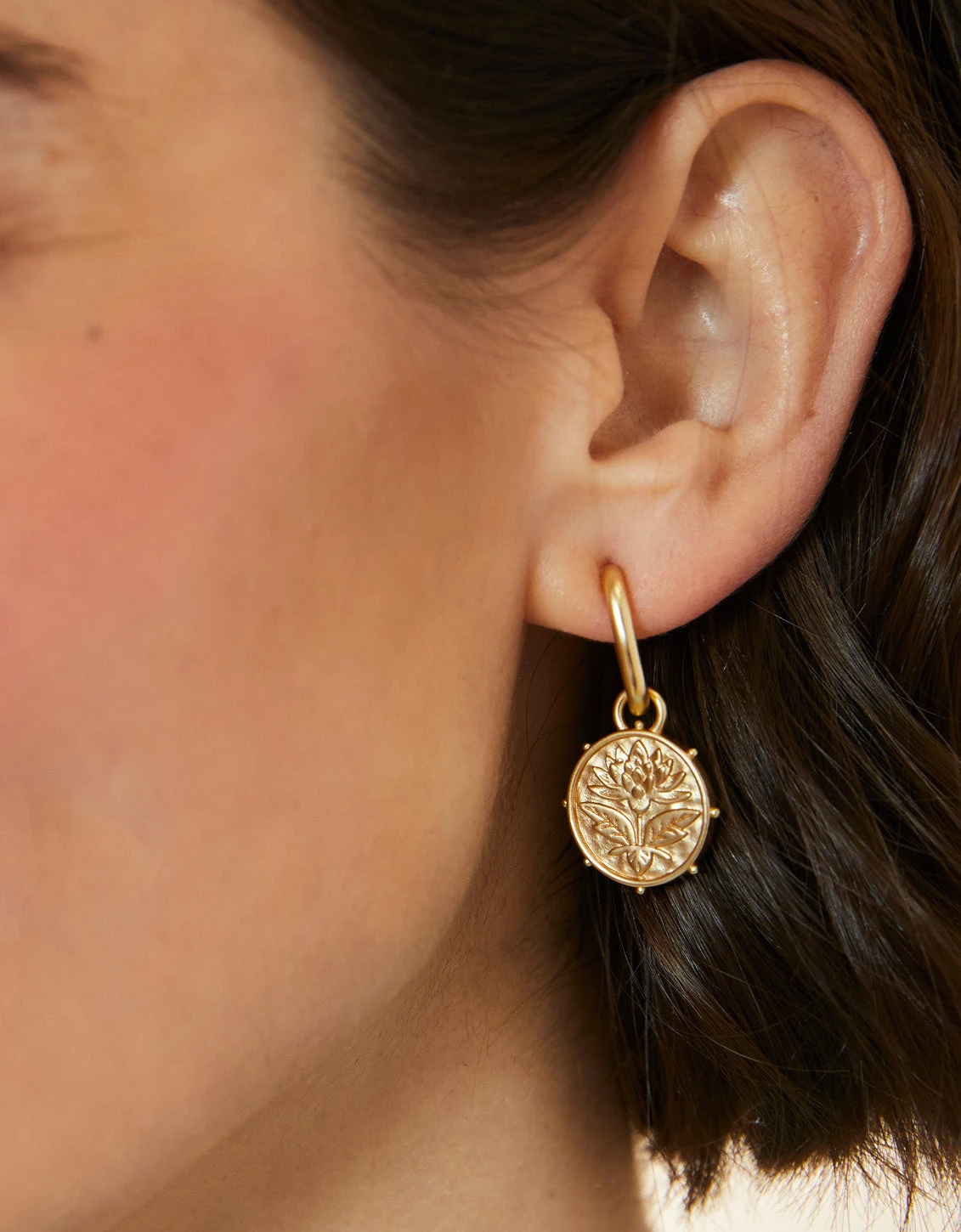 Dangling from golden hoops is an embossed lotus charm in 18kt matte gold plating, creating our Lotus Drop Hoop Earrings. It’s where subtle style meets endearing elegance. Bonus: remove the stone drop for a simple gold hoop. 2-looks-in-1!