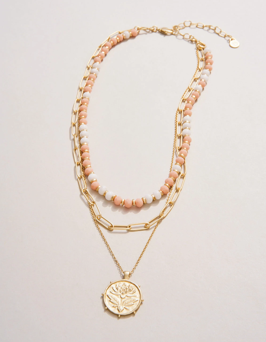 Layer on Spring charm with our Lotus Layered Necklace, featuring a pre-layered group of 3 chains. The shortest layer features glass and metal beads, the middle layer is a paper clip chain, and the longest layer features an embossed lotus pendant on a dainty chain. Each chain slips off the clasp so you can change the layers to suit your style.