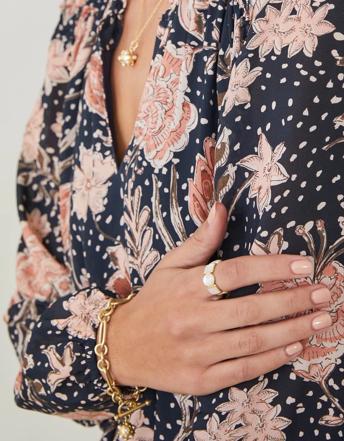 Our statement making Maera Band Ring, with a glistening Mother-of-Pearl and Matte 18kt Gold Plating, adds personality to every gesture, and we think our manicures have never looked better!