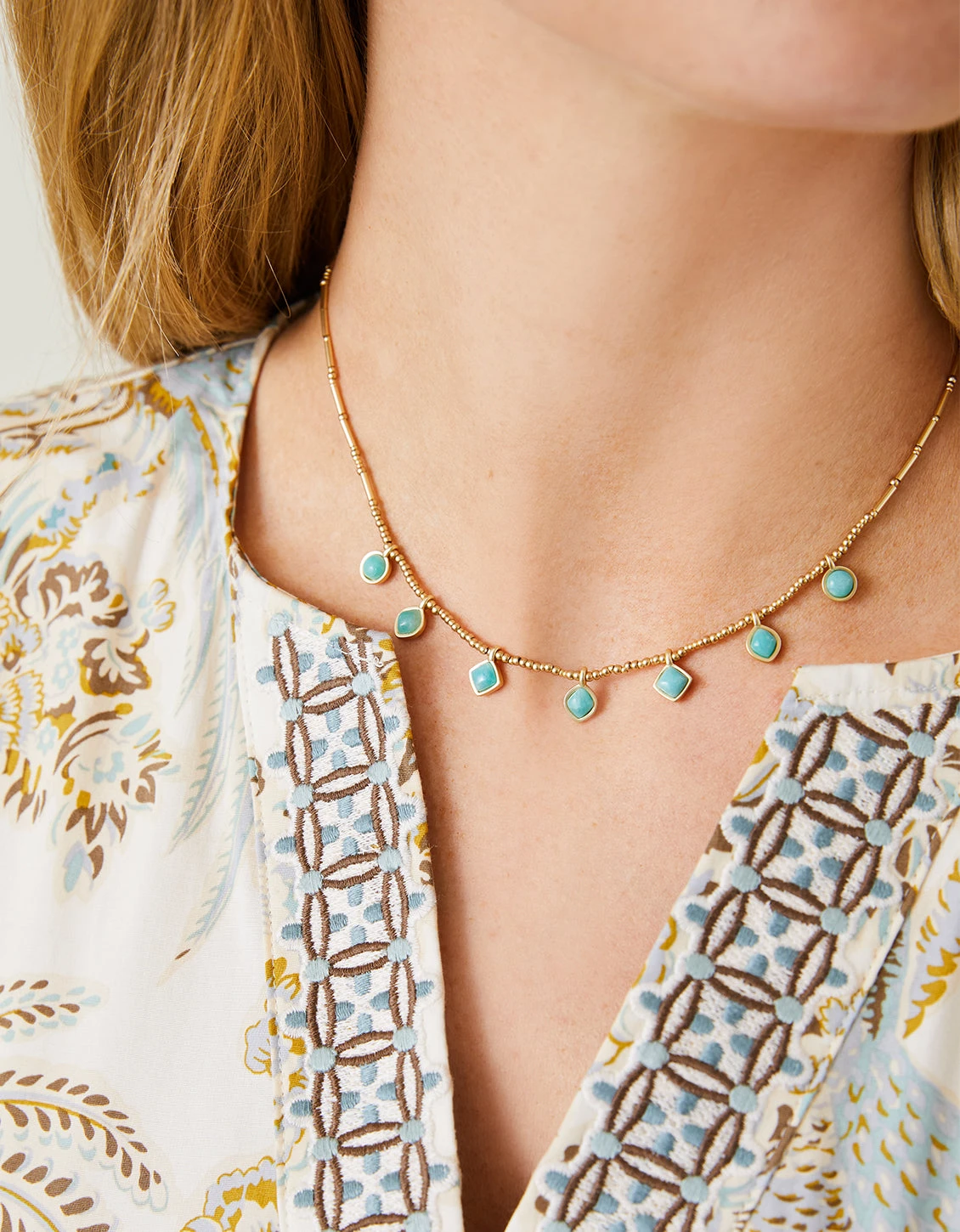 Your boho, coastal style shines through our Maera Bitty Bead Necklace in 18kt matte gold plating with its natural amazonite charms dangling from its dainty beaded chain. Please note: This design features natural stones and each piece is one-of-a-kind. Colors and patterns may vary slightly from the image shown.